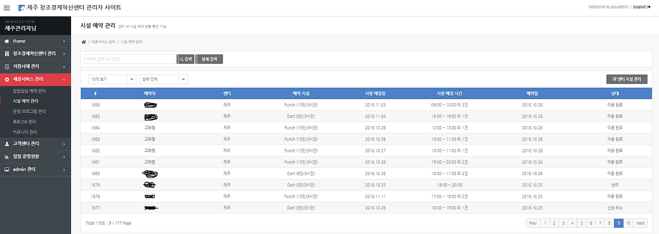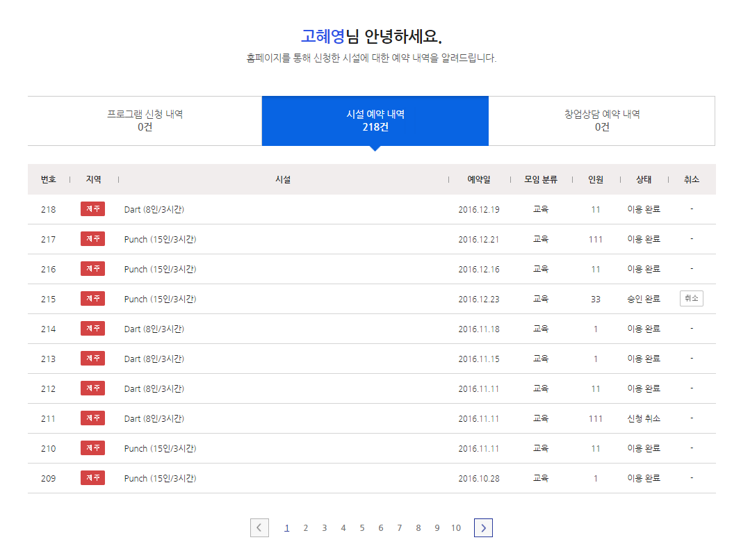 내가 예약한 시설 예약을 볼 수 있습니다. 줄줄이 되어 있어서 예전에 예약한 건이라면 페이지를 쭉쭉 넘겨서 찾아야 합니다.
