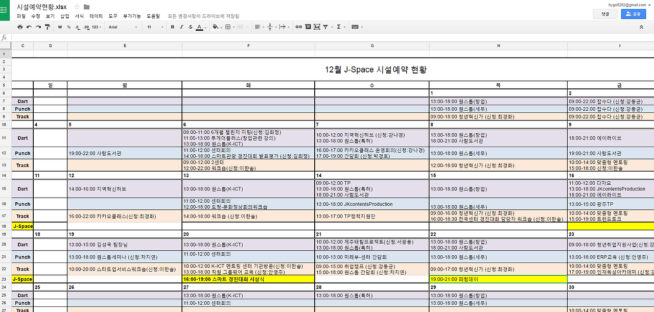 그래서 승인과 동시에 구글 엑셀 시트에 옮겨 적습니다. 표의 양식을 다음과 같이 만들었고, 한눈에 날짜와 회의실의 예약 현황을 볼 수 있도록 했습니다. 혹시라도 입력을 실수하면 이 시트를 보는 팀원들은 잘못된 정보로 일정에 큰 차질이 생길 수 있습니다. 표를 보고서 바로 신청을 넣어달라거나 신청건을 취소해달라고 하는데, 신청/취소/승인 과정이 얼마나 번거로운지 그들은 모를 겁니다;; 말 한마디에 그냥 적는 그런 게 아니랍니다;;