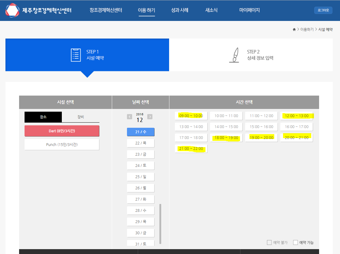 로그인을 하고 시설 예약을 들어가면 다음과 같은 화면을 만나게 됩니다. 회의실과 날짜를 선택하면 예약 가능한 시간이 나옵니다. 한 시간 단위로 누를 수 있고, 연달아 체크해야 합니다. 회의실 신청 가능 시간은 오후 6시까지 이지만, 신청 화면에서는 저녁 10시까지 되어 있네요. 6시 이후로 체크하면 어차피 반려처리될 텐데.. 전혀 블락이 되지 않습니다.