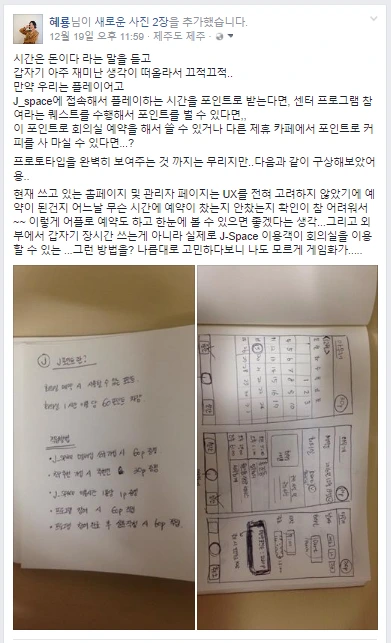 이런 번거로움에 저는 깊은 고민에 빠지기 시작합니다. 특히 회의실은 J-Space 멤버나 입주 및 보육기업이 이용할 수 있게 만들어서 운영하고 있는데, 오히려 외부 기관에서 요청이 많이 들어오고 도청이나 기업에서 회의공간이 부족하다며 신청을 잡아달라는 요구도 많이 들어옵니다. 그럴 경우, 저희는 기관대 기관으로 어쩔 수 없이 승인 하지만 진정 이 회의실에서 아이디어 회의를 해야 하는 회원들은 이용하지 못하니 컴플레인을 걸 수밖에요.. 누구를 위한 J-Space인가!!!!