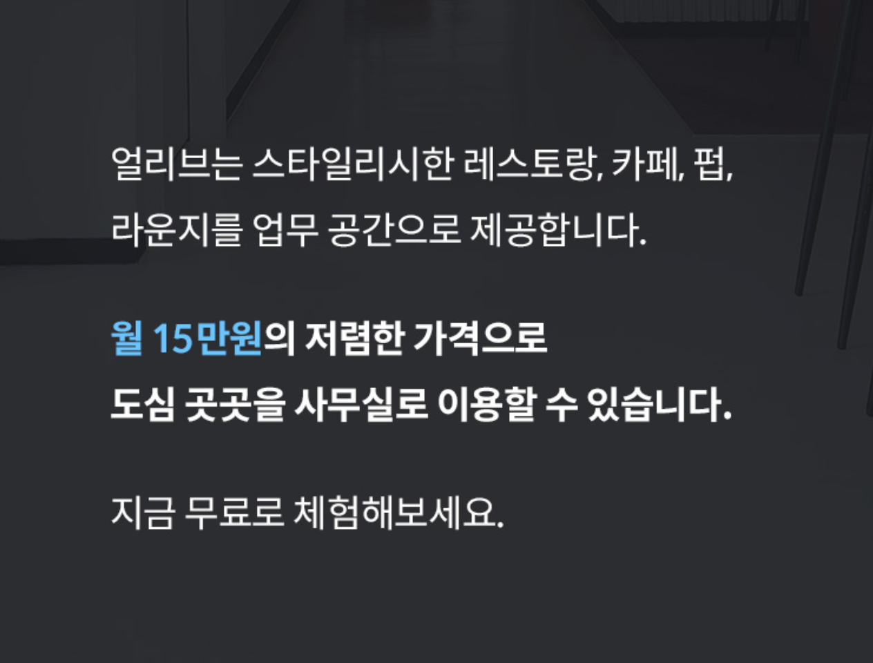 얼리브의 사업개발팀은 얼리브 공간을 이용하는 멤버에게 어떻게 하면 더 좋은 경험을 하게 만들까를 고민하는 팀입니다. 얼리브 워크스페이스를 어떻게 운영할 것인지, 공간의 제휴는 어떻게 하고, 멤버들에게 공간을 어떻게 소개하면 좋을지 고민하고 기획하여 실행하는 팀입니다.