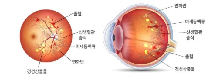 이렇게 당뇨로 순환의 장애가 생겨 혈관에서 삼출물이 나와 부종이 생기거나 모세혈관이 파괴되면서 신생혈관 및 흉터 조직이 생기게 된다.