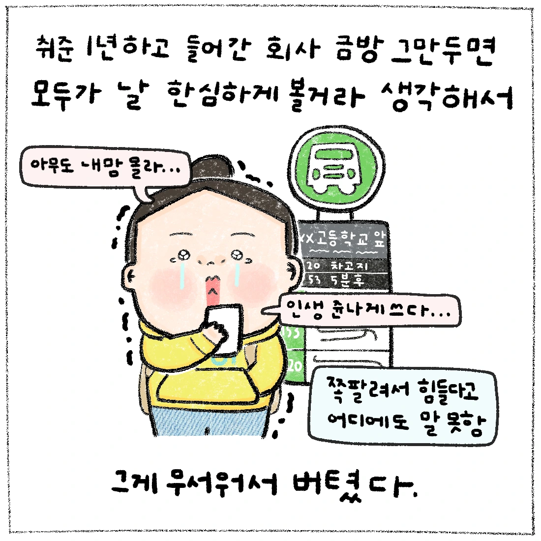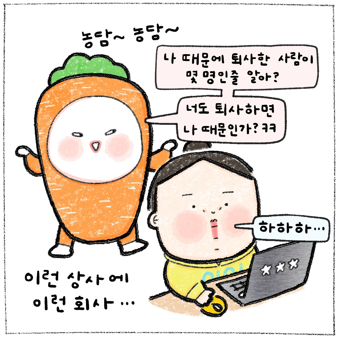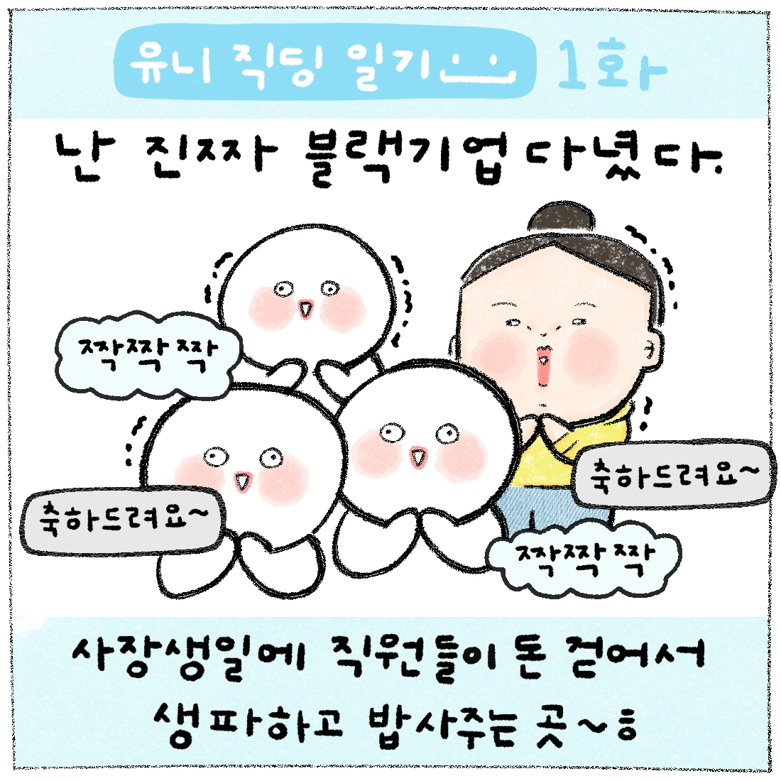 이 만화를 브런치에 올리며 덧붙이고 싶은 말은, 회사는 회사인거다. 회사에서 많은 상처를 받은 사람들이 어디에서든 다들 위로를 받으면 좋겠다. 내 만화로 위로를 받으면 더욱 좋쿠...