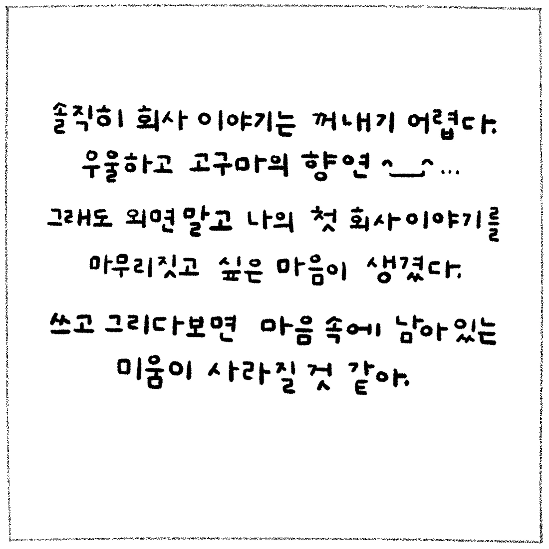 긍정적인 이야기만 하고 싶고 또, 사람들은 긍정적인 이야기를 더 좋아하니까 회사 이야기는 적당히 하고 멈추려고 했다. 하지만 그게 쉽지 않았다. 내 마음 한 구석에 이 이야기를 끝나쳐야 한다는 생각이 계속 들었다.