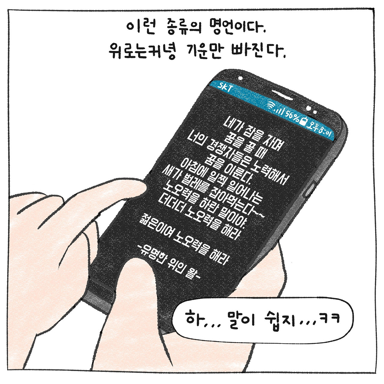명언이나 글귀 읽는 걸 무척 좋아하는 편이지만 '일찍 일어나는 새가 벌레를 먼저 잡아먹는다.', '네가 꿈을 꿀 때 너의 경쟁자는 꿈을 이룬다.' 류의 글은 안 좋아한다. 랜선 회초리질 당하는 기분이고 좀 불쾌해진다.
