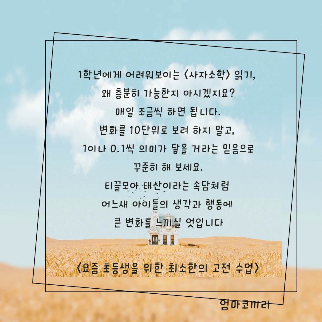 저학년도 고전 읽기가 가능할 뿐 아니라 하는 게 좋다고 추천하는 책이었다. 지금의 나에게도, 아이에게도 인문 독서를 시도해 볼까 하는 마음으로 읽기 시작했다. 1학년도 사자소학을 읽을 수 있고, 심지어 한자도 같이 공부할 수 있다는 이야기에 놀랐다.