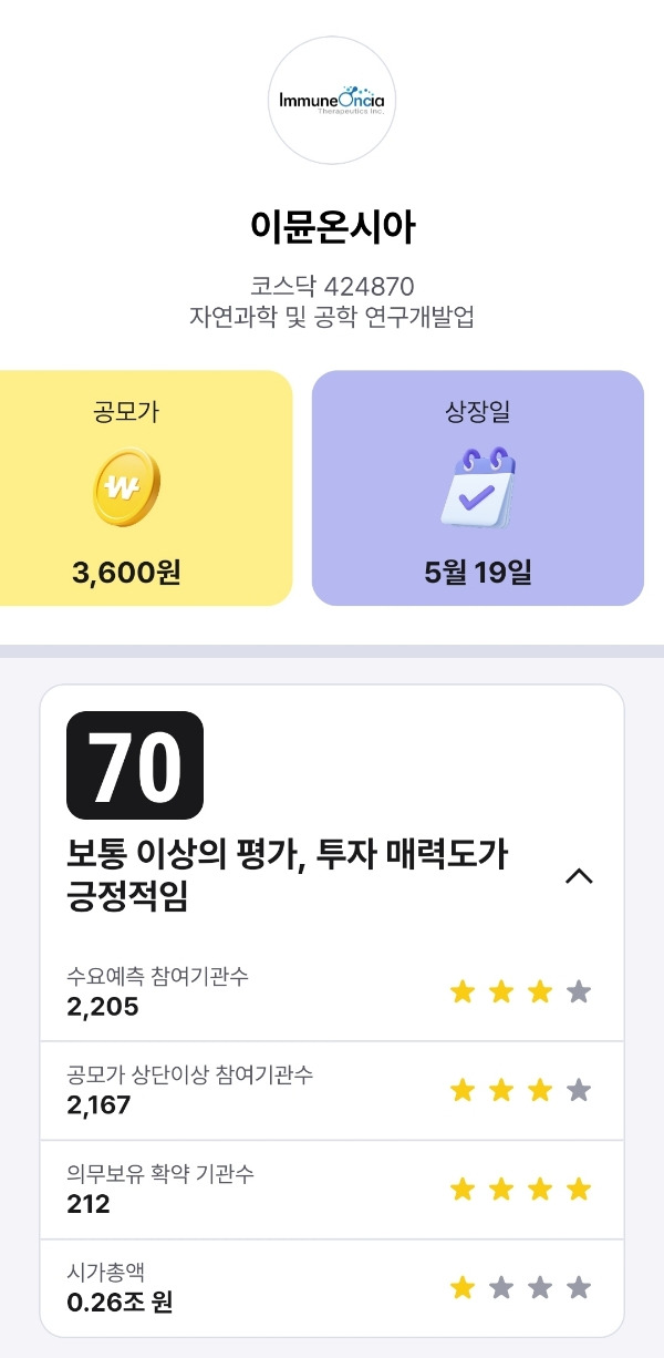 이뮨온시아는 일육공 앱에서 70점이라는 제법 좋은 점수를 받았다. 공모가는 3,600원으로 소액이었지만 7주를 배정받았기 때문에 잘 팔아보자고 다짐하며 증권 앱에 접속했다.