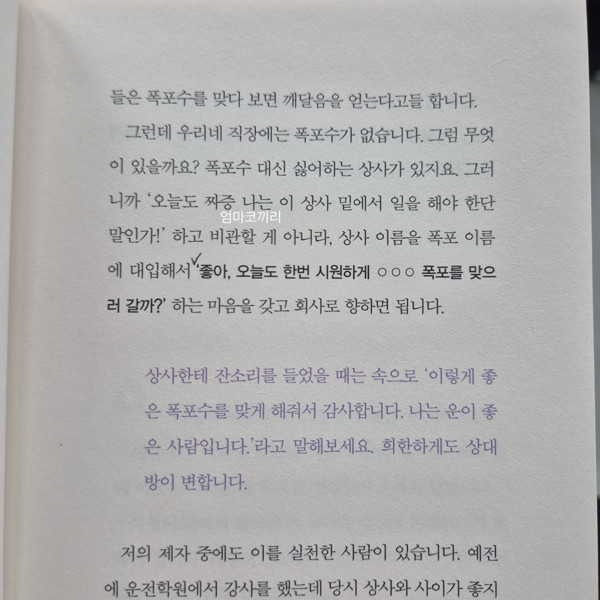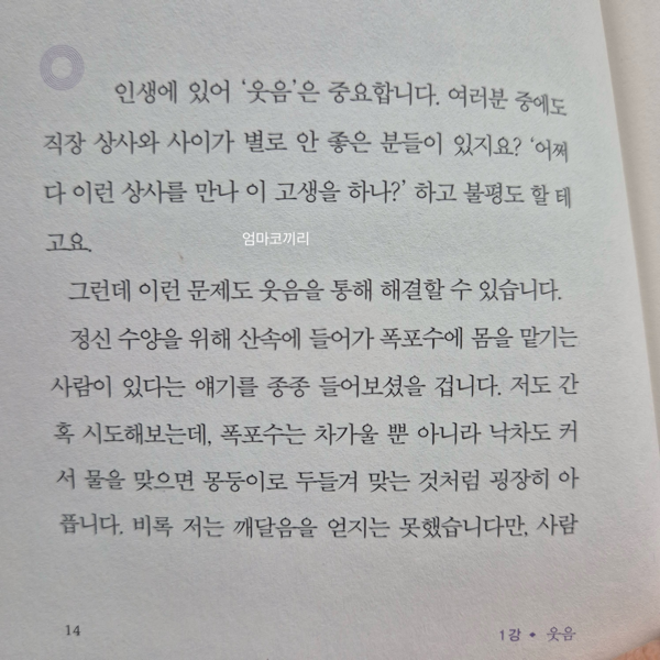 이 책을 읽으며 가장 인상적이었던 부분은 바로 위의 문장이었다. 웃음이 중요하다는 이야기를 하며 싫어하는 직장 상사를 폭포수로 생각하며 시원하게 맞으러 가겠다는 마음으로 출근을 한다는 걸 보면서 웃음이 터졌다. 그리고 이걸 나에게 적용한다면 어디에 적용해야 할까 생각했다.
