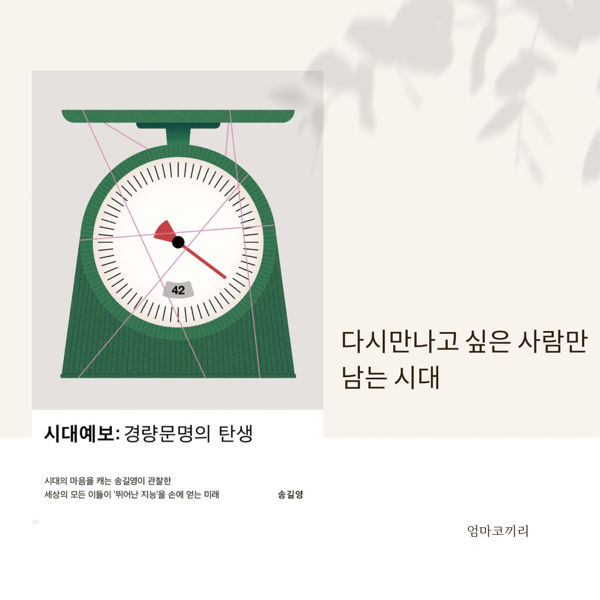 시대는 빠르게 변하고 있고, 잠시 머뭇거리다 보면 나만 혼자 뒤떨어져있을 것만 같다. 유튜브에서도 지금 시대의 변화를 이야기하는 사람들이 많이 있는데 아무래도 나는 책으로 보고 싶었다. 그래서 빅데이터 기반으로 분석하고 있는 송길영 님의 최신간 <시대 예보: 경량 문명의 탄생>을 읽었다.