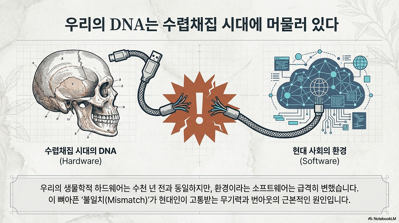 이 책은 우리가 수렵채집 시대의 DNA를 가지고 있다는 데서 출발한다. 몸은 바뀌지 않았는데, 환경이 너무 빨리 바뀌어버려 문제라는 것이다.