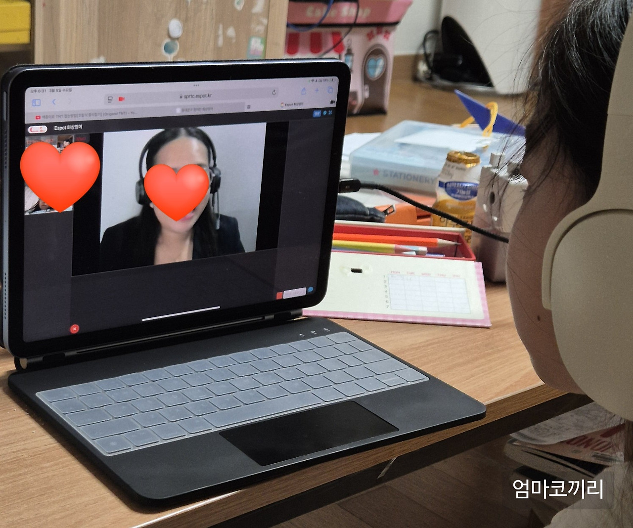 수업은 30분간 진행이 됐고, 선생님은 아이가 대답을 못하면 기다려주시지만 말을 하다 보면 속도가 좀 빨라지기도 했다. 그리고 이런 수업이 처음이라서 일상적으로 하는 질문에도 무슨 대답을 해야 하는지 낯설어하기 바빴던 우리 어린이는 수업을 마치자마자 진이 빠진 것 같았다. 같이 수업을 듣는 친구가 뭐라고 대답해야 하는지 한국어로 말을 해주기도 했는데 너무 정신이 없다 보니 친구 말도 안 들렸던 것 같다. 그게 한편으로는 너무 귀여워 보이면서도 너무 부담스러운 게 아닐까 걱정도 됐다.