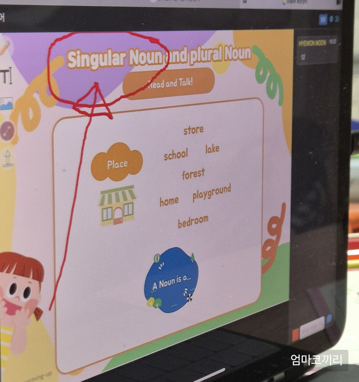 그리고 드디어 오늘, 대망의 첫 수업이었다. 주 3회 1대 3 수업을 신청했는데 오늘 보니 1대 2로 수업이 진행되는 듯했다. 첫날이라 옆에서 지켜보는데 같이 수업을 듣는 친구는 첫 수강이 아닌지 훨씬 능숙해 보였다. 그 친구를 보며 수업을 따라갈 수 있을까 지켜보는데 수업 내내 내 도움이 필요했다. 아이는 잘 모른다는 말도 할 수 없었고, 선생님의 말을 알아듣기 순간들도 있었기 때문이다. 굳이 교재가 필수는 아니라고 했는데 첫 수업을 듣는 오늘의 주제는 Singular Noun과 Plural Noun이었다. 국어에서도 품사를 안 했는데 영어로 명사가 뭔지 알 수가 없는 우리 어린이는 가만히 얼어있었다.
