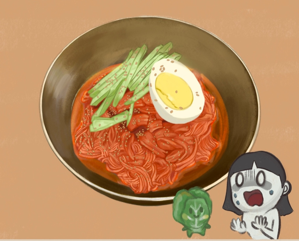 은빛 오목한 냉면기에 얌전히 또아리 튼 흑색 면발. 보기만해도 매콤한 고추장 양념, 절인 오이와 무, 그리고 달걀 반숙, 파 송송, 깨 솔솔 올라온 비빔냉면 한 그릇. 동생과 나누지 않고 내 몫으로만 주어진 온전한 한 그릇이 머릿속에서 동동 떠다녔다. 조리하는 엄마 옆에 붙어있다가 신이 나서