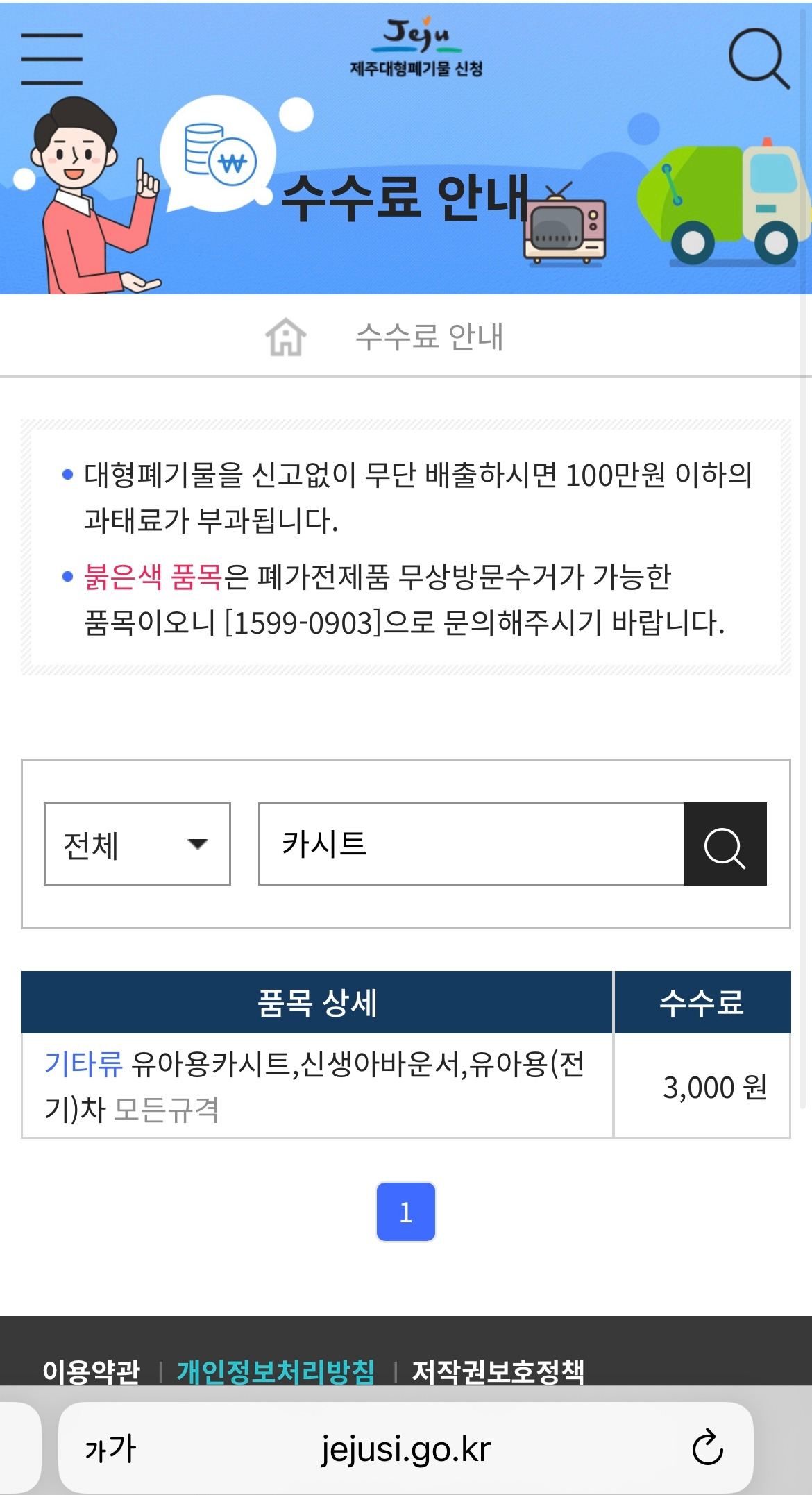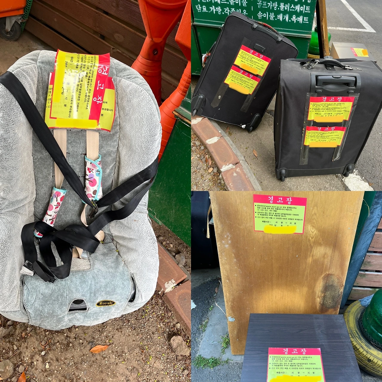 카시트를 버리는 데 얼마가 드는지 시청 홈페이지에 들어가 검색을 해보았다. 단돈, 3,000원. 아이의 안전을 걱정해서 카시트를 구입해서 장착할 정도의 마음을 가진 사람들이, 3,000원이 없어서 폐기물 신고 필증을 사지 못했던 걸까? 여행용 가방 2개 6,000원(3,000원x2개), 서랍장은 크기에 따라 다르긴 하지만 버려진 2단 서랍장은 크기가 작으니 4,500원, 문짝도 비슷한 가격이면 될 것 같았다. 한 집에서 나온 쓰레기라고 가정한다고 해도 세 종류의 대형 폐기물을 정상적인 방법으로 처리하는 데 18,000원이면 충분했다. 주말 저녁에 먹는 치킨 한 마리 정도의 돈 때문에 양심을 져버린 것이다.