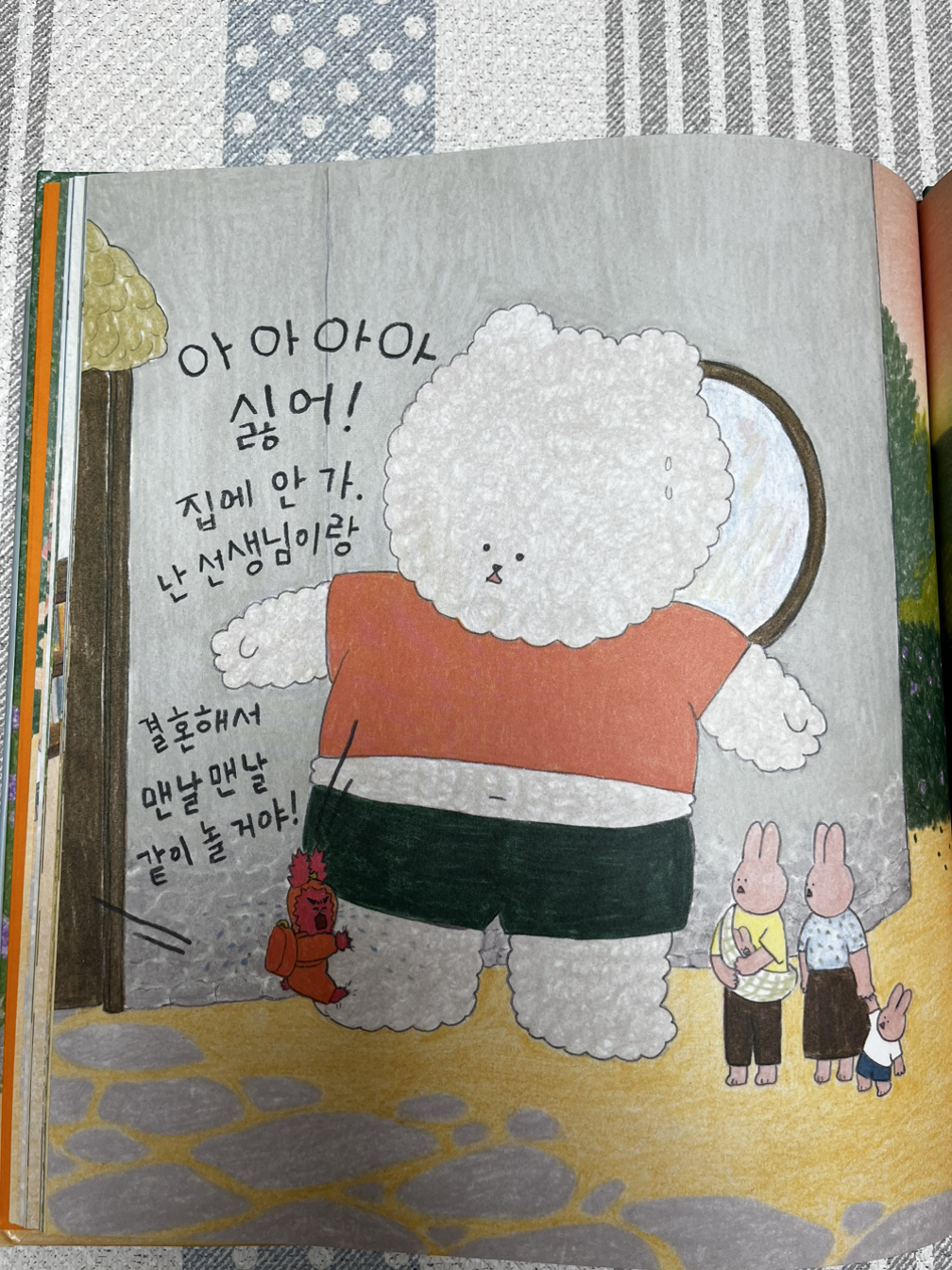 어린이집에서 유치원으로 옮기고 며칠 뒤에 아이가 코로나로 일주일간 등원하지 못했다. 새로운 환경에 적응을 해야 할 때에 장기간 결석을 한 뒤 다시 등원을 하고부터 유치원에 가기 싫다는 말을 매일 했다. 하루만 더, 하루만 더, 한 달만 다녀보자고 하면서 유치원에 다녀온 아이를 안고 <당근 유치원>을 읽어주었다. 유치원에 가기 싫은 아이가 여기도 있다며 빨간 토끼의 마음이 자기의 마음 같다고 했다.