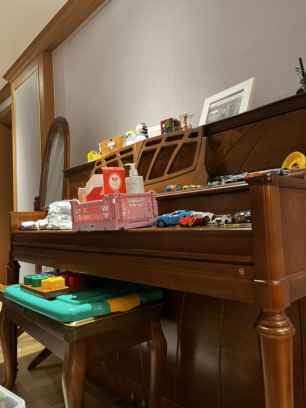 피아노 위에는 가족사진이 들어있는 액자와 디퓨저 미니 선인장이 상주하고 가끔씩 아이가 유치원에서 만들어오는 각종 소품들이 머물기도 한다. 그리고 요즘엔 둘째 기저귀와 로션같이 육아용품이 건반 뚜껑에 올려져있다. 당근으로 들였던 기저귀 갈이대는 아기가 엎치기 시작하면서 지인의 집으로 보내졌고, 이후 기저귀를 수납할 트롤리를 따로 구비하지 않다보니 갈 곳 없는 기저귀가 피아노에 자리를 잡았다. 보기에 심히 아름답지 않지만 아기가 기저귀를 뗄 때까지는 어쩔 수 없을 것 같다. 이건 업라이트가 아니라 그랜드 피아노였어도 마찬가지였을 거다.