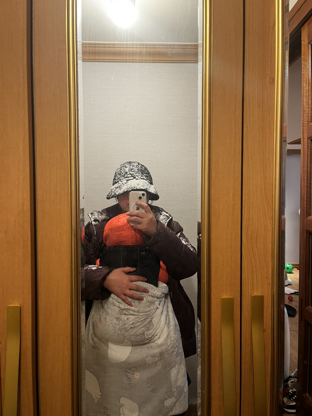 우산은 챙기지 않았다. 아기를 안고 한 손으로 우산을 들면 위험할 것 같았다. 대신 모자를 썼다. 아기에게도 우주복에 달린 모자를 씌웠다. 기모가 풍성한 우주복을 입혔지만 담요로 한 번 더 감쌌다. 아기에게는 첫 겨울. 차가운 눈송이가 볼에 닿는 감촉이 신기했는지 연신 고개를 들던 아기는 서늘한 공기의 매서움을 알아채고는 이내 품속으로 얼굴을 파묻었다. 눈길이 미끄럽기도 하고 바람 때문에 눈발이 가로로 휘날리는 통에 걷는 게 생각보다 쉽지 않았다. 경사가 가파르지는 않지만 아파트 단지 내 언덕을 내려갈 때는 혹시라도 미끄러질까 봐 한 발 한 발 조심히 내디뎌야 했다. 눈을 치우고 계시던 관리사무소 직원분께서 내 발 앞에 발을 받치며 같이 움직여주셨다.