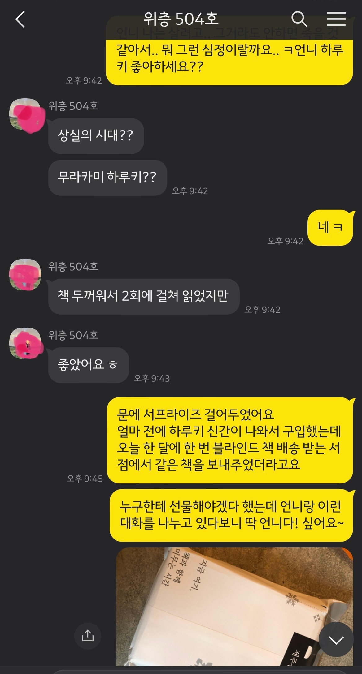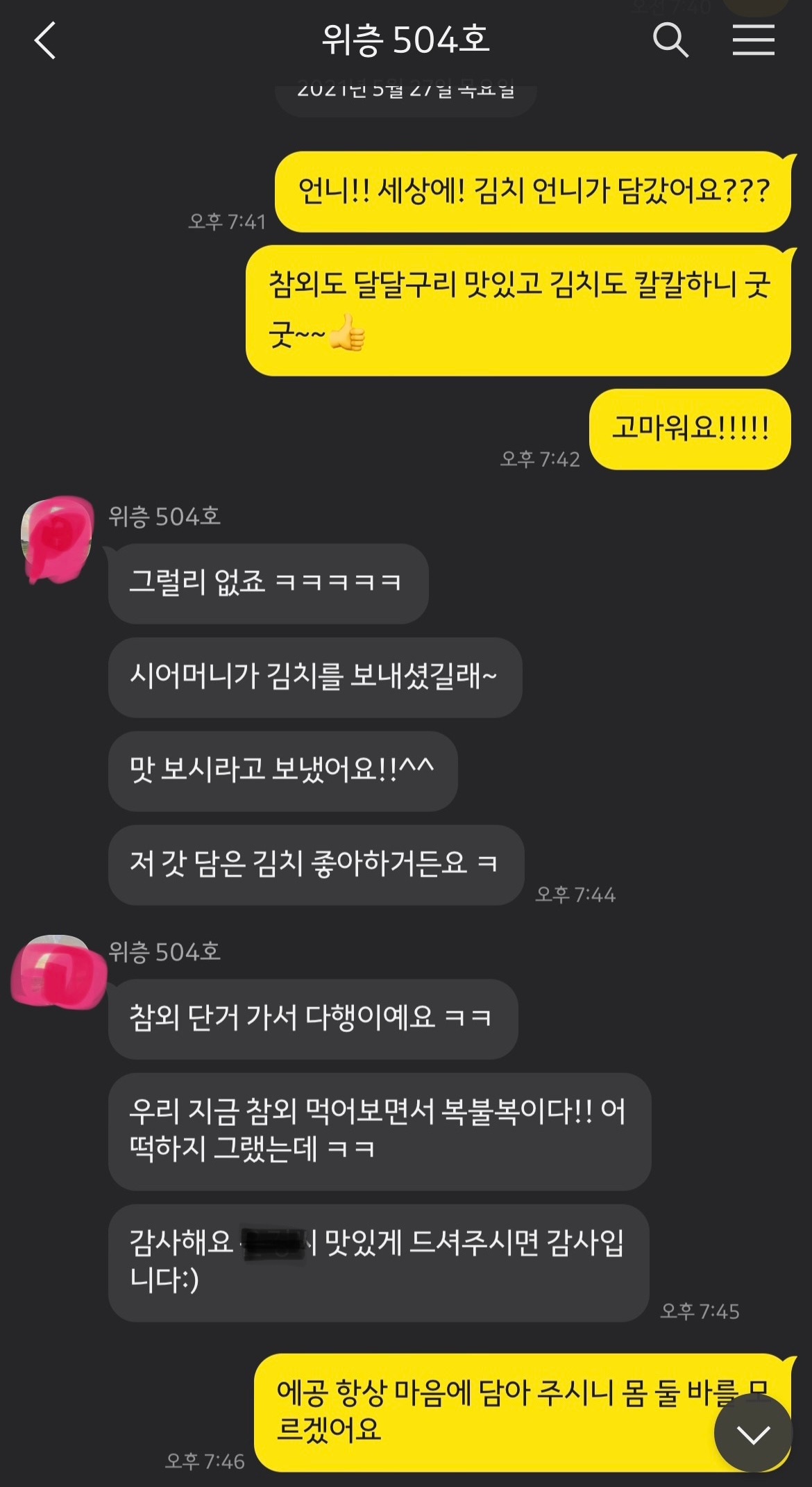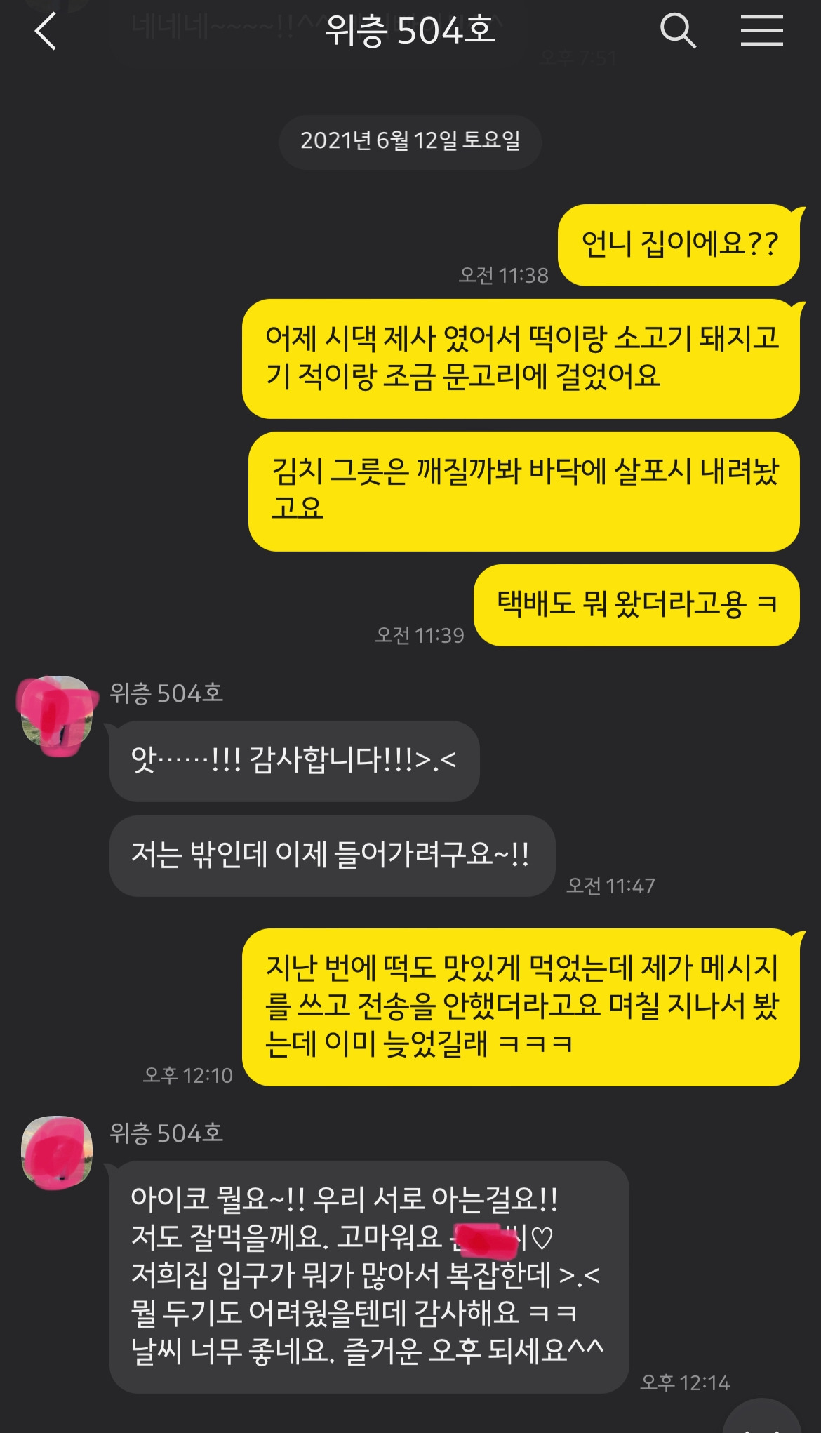 아침에 출근해서 컴퓨터를 켜는 것으로 일과가 시작된다. 카톡 알림이 떠서 휴대폰을 봤더니 위층 사는 언니가 메시지를 보내왔다.