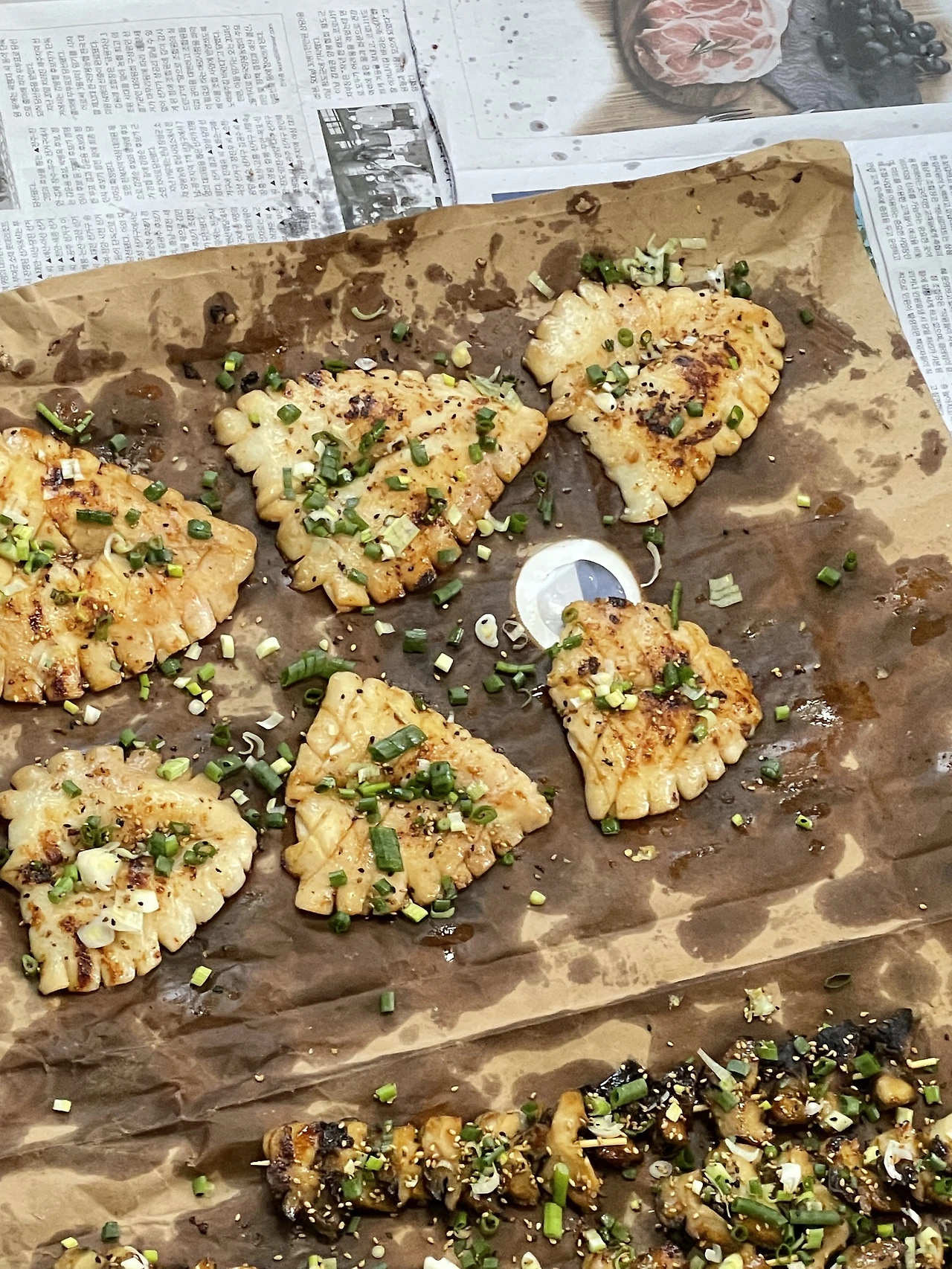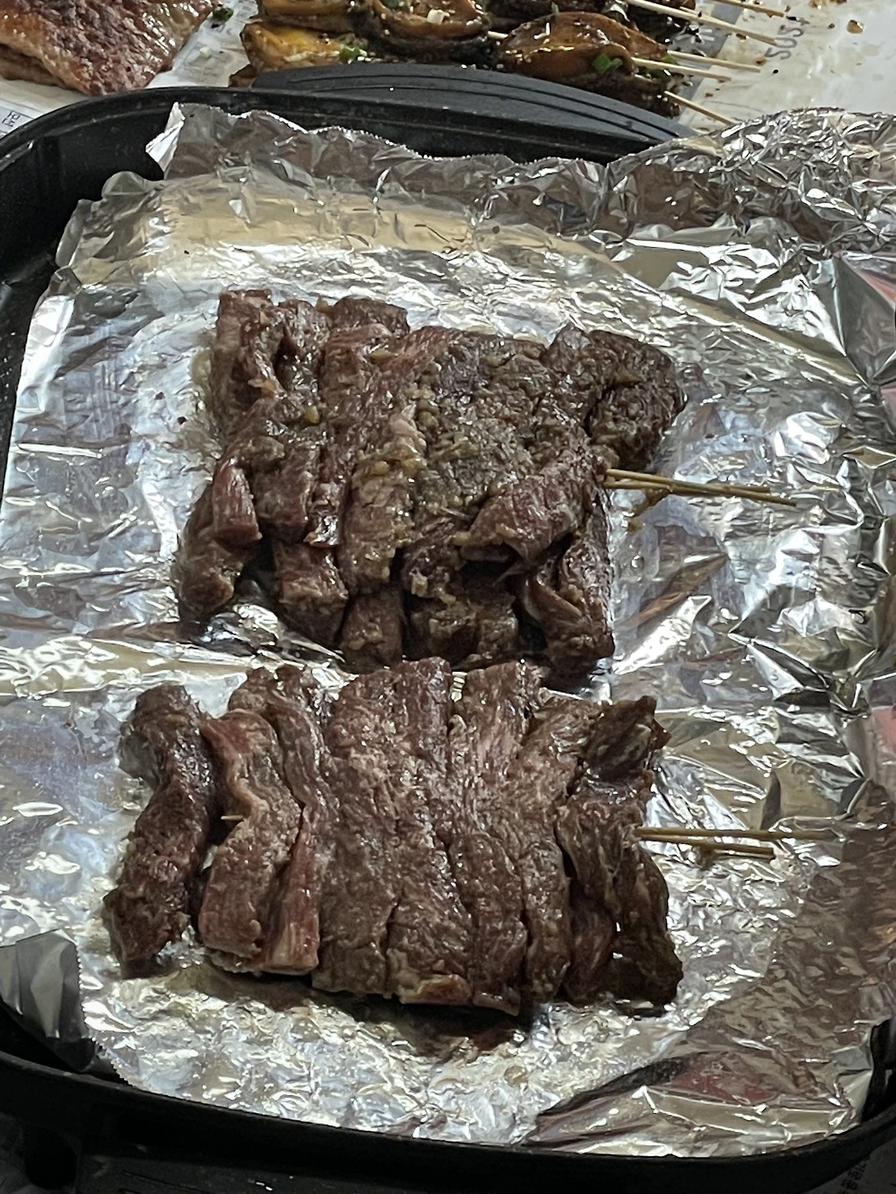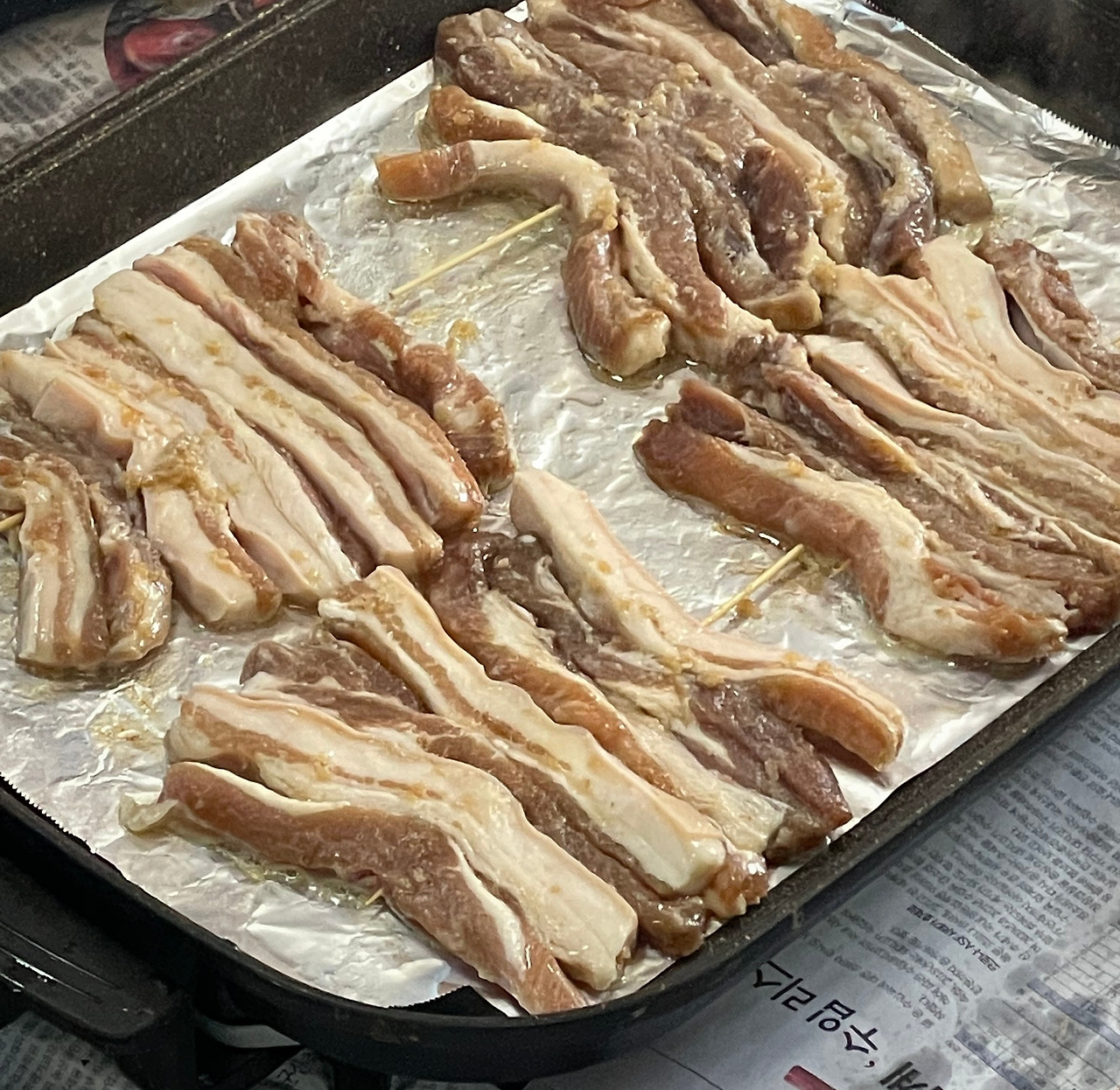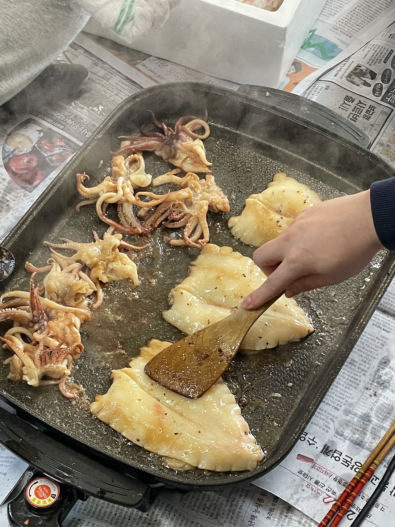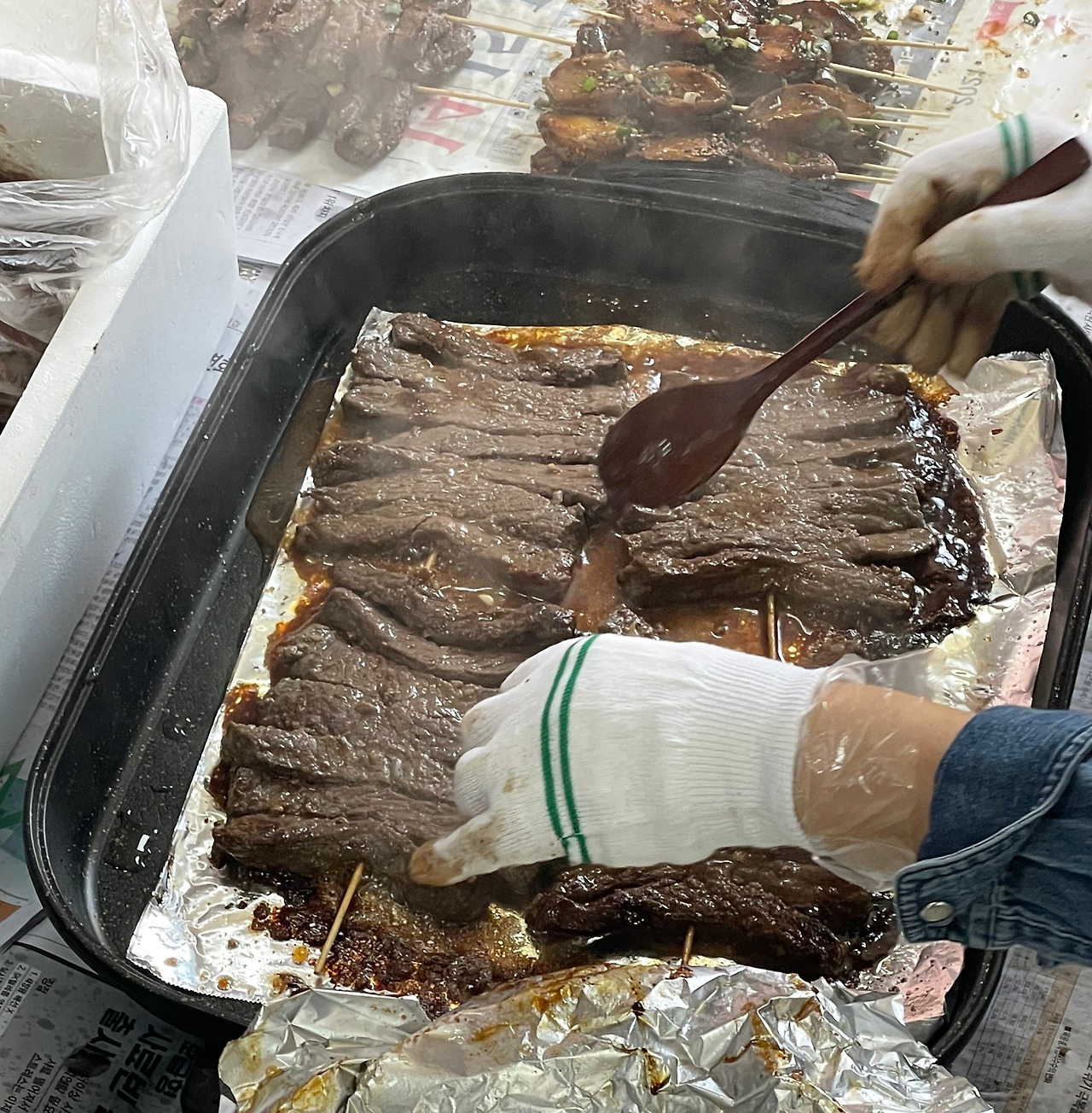 제주에서는 고기산적을 지지는 방식이 특이하다. 소고기와 돼지고기를 중지 손가락보다 조금 길게 잘라 꼬지에 꽂은 후 양념을 해서 지진다. 어릴 적 큰집에서 보았던 네모난 고기 산적의 모양과는 사뭇 다르다. 차례상에 오르는 음식에도 약간의 차이가 있다. 한치와 소라, 전복 꼬지는 육지에서는 보지 못했던, 바다와 밀접한 제주도의 지역 특색이 반영된 음식들이다. 처음에는 낯설고 무엇을 해야할지 모르던 육지 며느리였는데 이제는 '제주댁'이 다 되었다. 그래도 가장 중요한 장보기와 양념재는 일은 오롯이 어머님께서 하고 계신다. 이 큰 일들이 내 차지가 되는 일이 되도록 천천히 오기를, (양가)부모님께서 부디 든든한 버팀목으로 우리 곁에 오래 계셔주시기를 간절히 바란다.