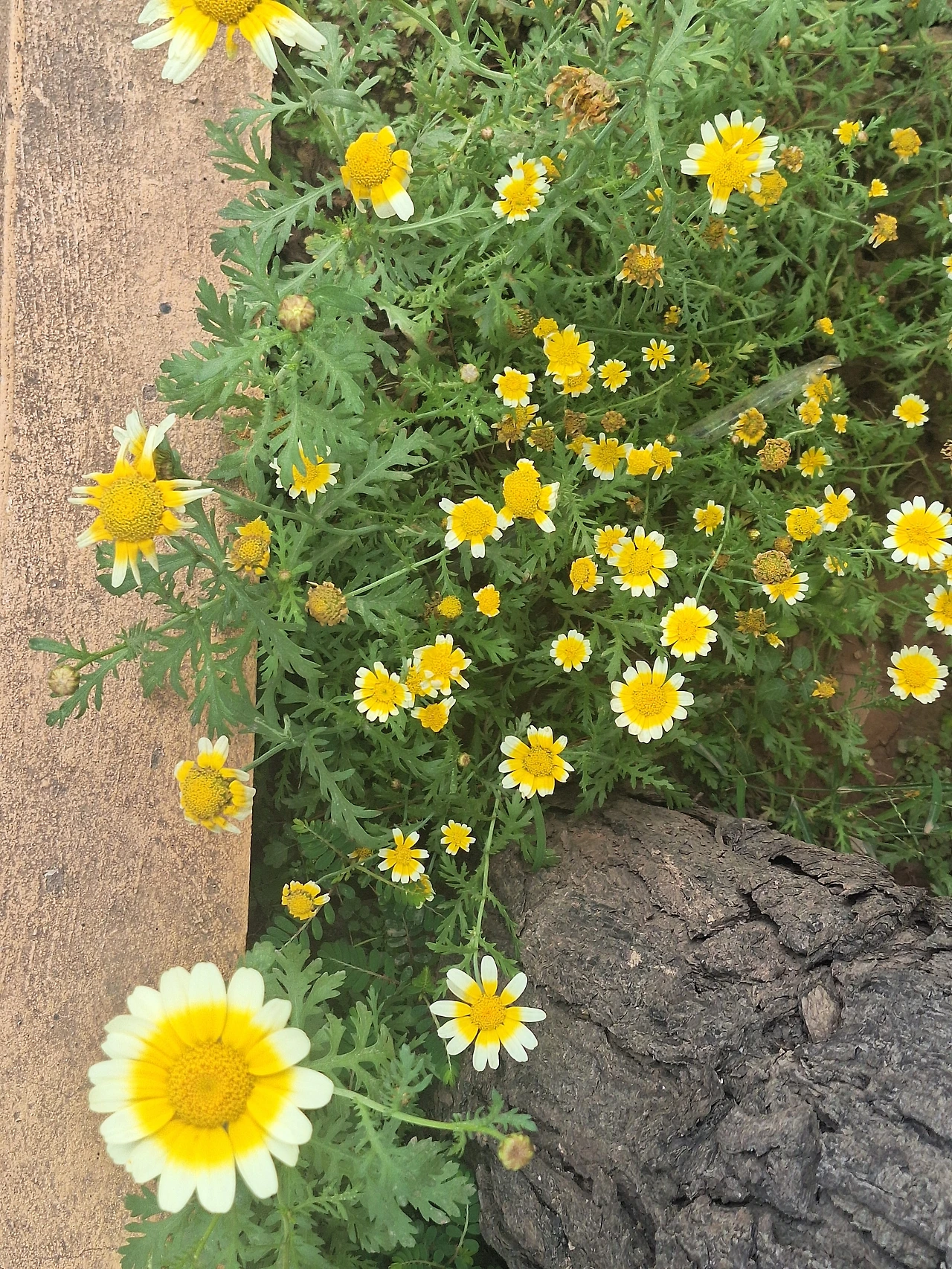 카페 입구에 활짝 핀 노란 쑥갓꽃이 보인다.