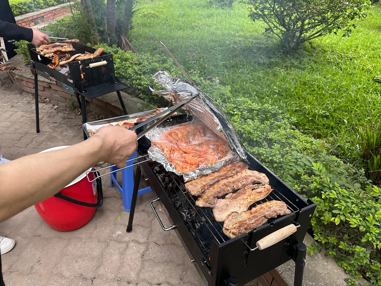 숯불을 피워 그릴 위에서 고기를 앞뒤로