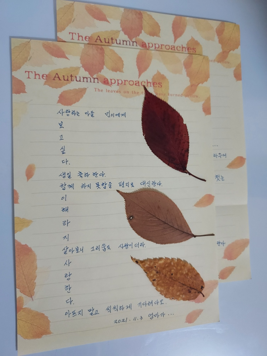 가을이 가고, 겨울이 오기 전 난 그리움과 보고픔을 달래러 한국을 떠날 준비를 할 것이다. 5월에 꽃을 만나고 초록의 싱그러움을 만나 설레었고, 여름을 보내주고, 가을을 만나 떨어지는 낙엽을 보며 감성에 젖었다. 또 겨울을 맞이 하며 헤어짐의 아쉬움과 만남이 기쁨을 알아가는 일이 삶의 수레바퀴인 것을...