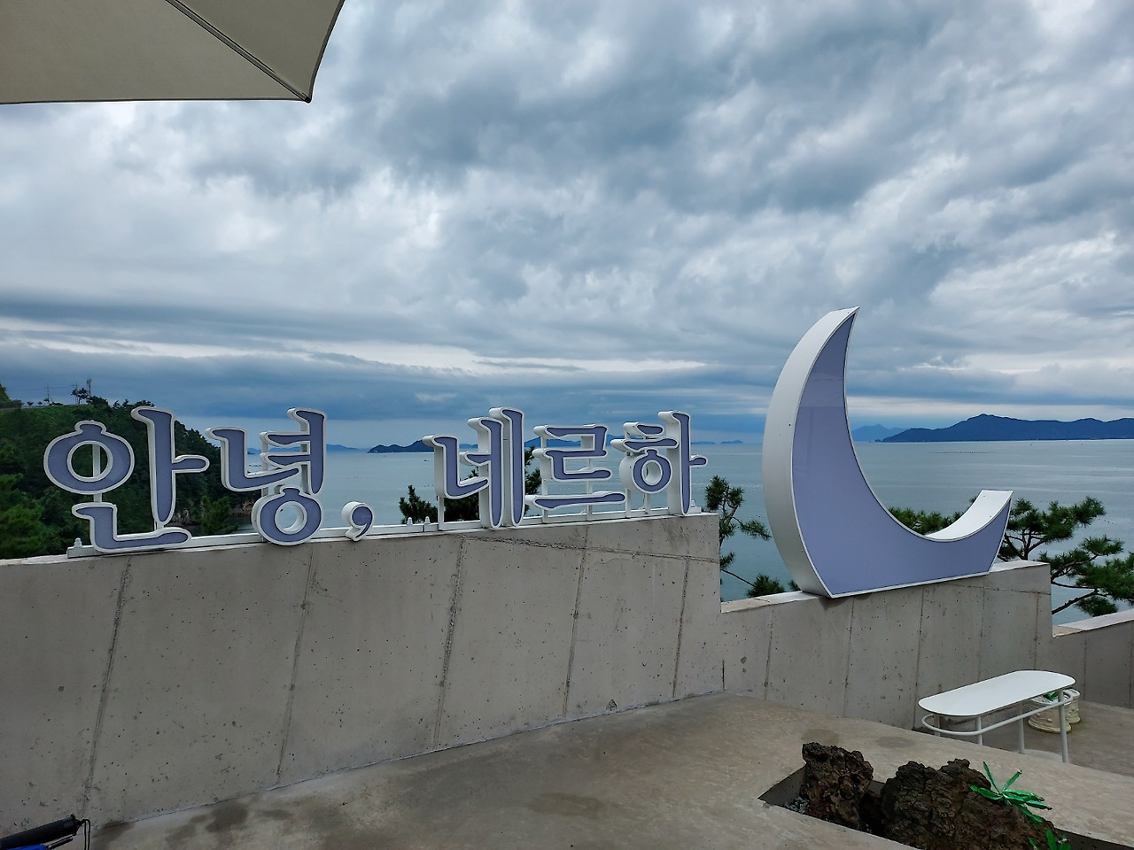 카페가 인사를 하며 반긴다. 안녕, 네르하? ㅎㅎ. 따뜻한 페퍼민트 한잔과 달달한 마키아또 한잔을 시키고 카페를 탐색한다. 3층 옥상 후들후들 유리벽을 만났다. 그러나 한번 용기를 내어 사진을 찍어보리라! 마음이 강해졌다. 이곳저곳 카페를 편안하고 멋지게 꾸며놓았다. 넓은 바다와 하늘은 오는 이들을 품어 주었다.