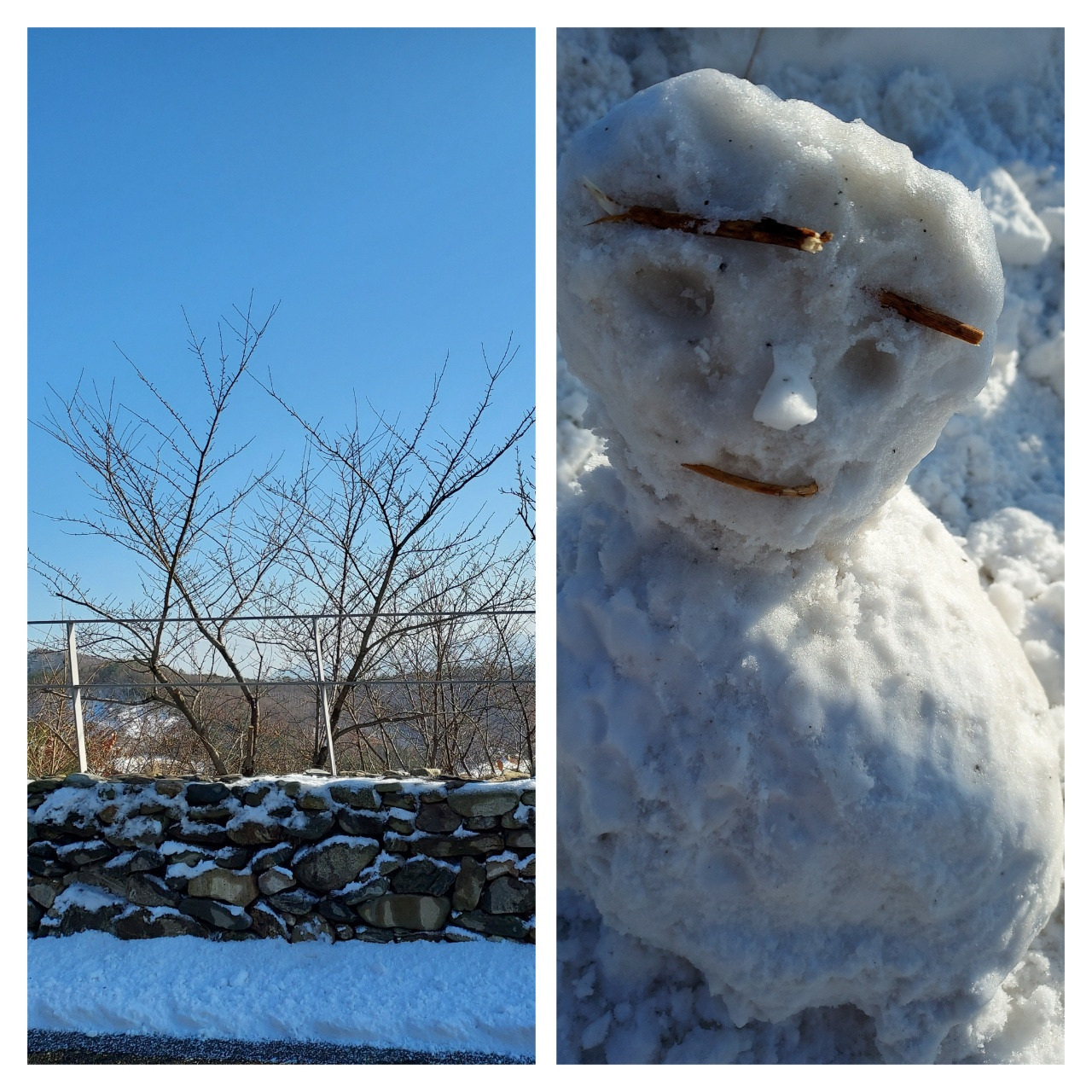 눈을 뭉쳐 서로 던진다. 동심이다. 난 뭉쳐놓은 눈덩이로 못난이 눈사람을 금방 만들었다. 나뭇가지를 주워서 눈과 입을 만들어주고 잠시 설경 감상후 아산 영인산 쪽 휴양림이 있는 곳 한옥 카페로 이동했다. 오늘은 주말 동생 부부와 셋이서 일상 탈출을 하였다.