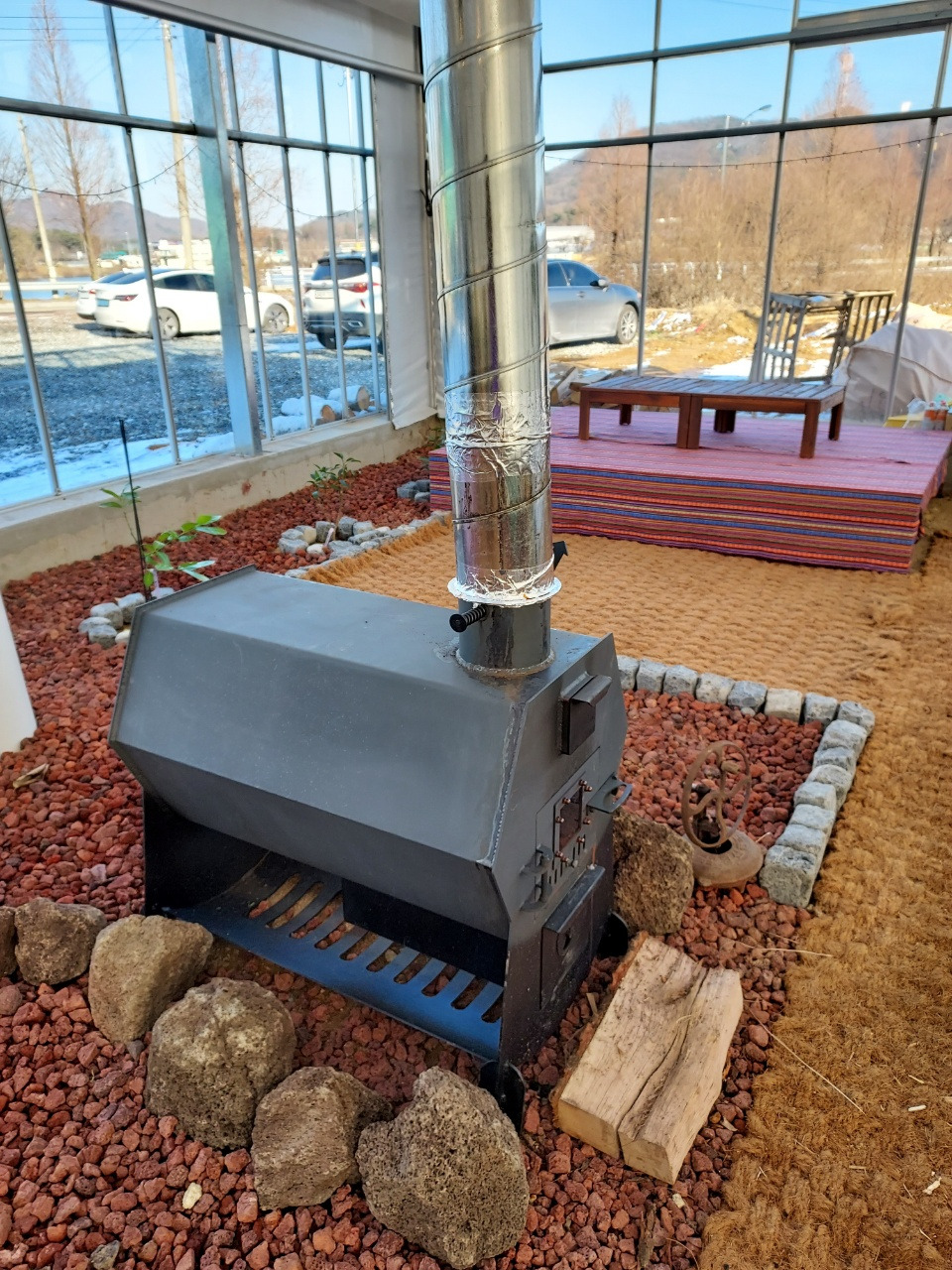 한옥앞 온실 하우스앞 장작들
