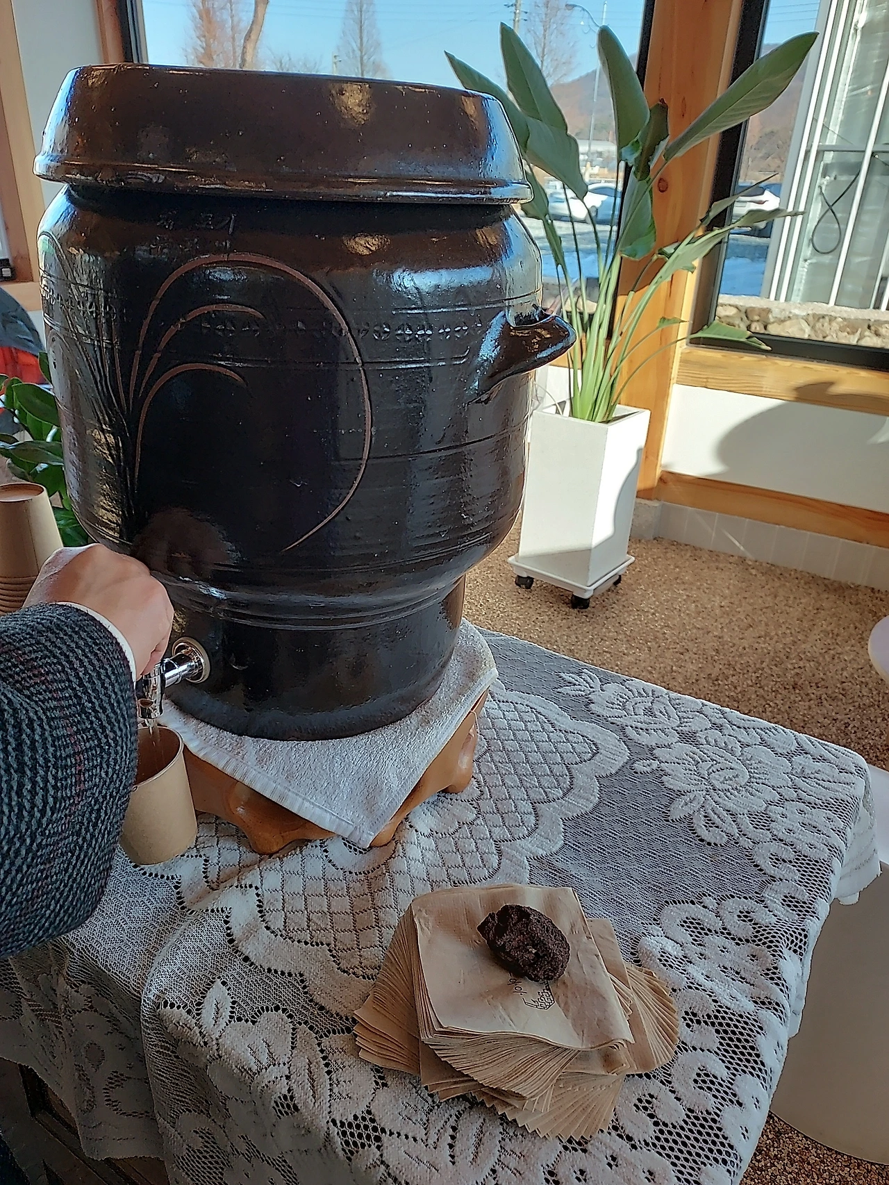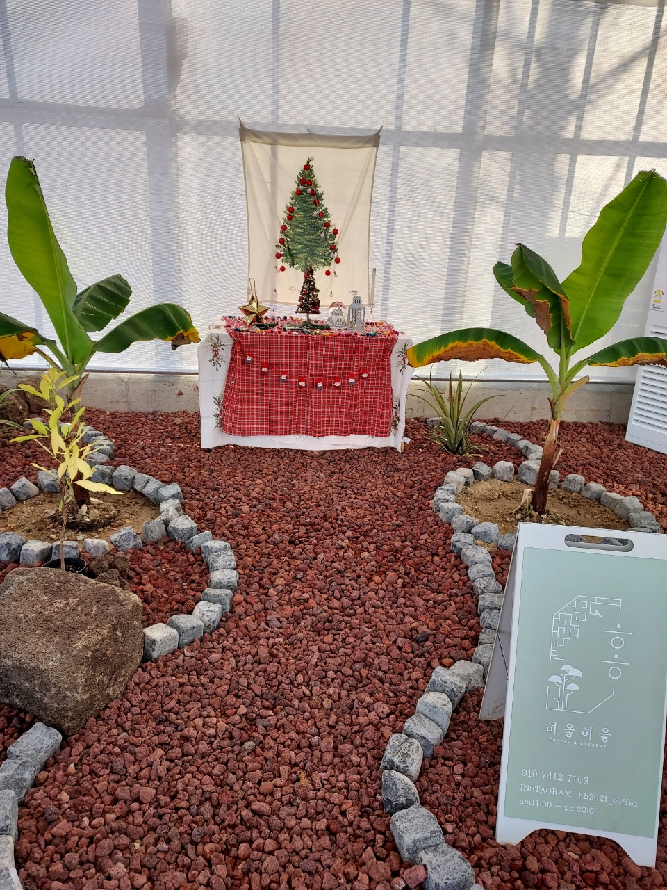 겨울 햇살이 창을 통해 들어오고 보통 정수기가 비치되어 있는데 항아리 물통이 비치되어 운치 있다. 이곳은 히읗히읗이다. 크리스마스분위도 나고, 난로의 따스함까지 따스한 유자차와 케이크로 달달 하고 달콤한 시간이 되었다. 손님이 많지 않아서 더욱 좋았다. 건물이 아직 새 거인듯한 모습이다.