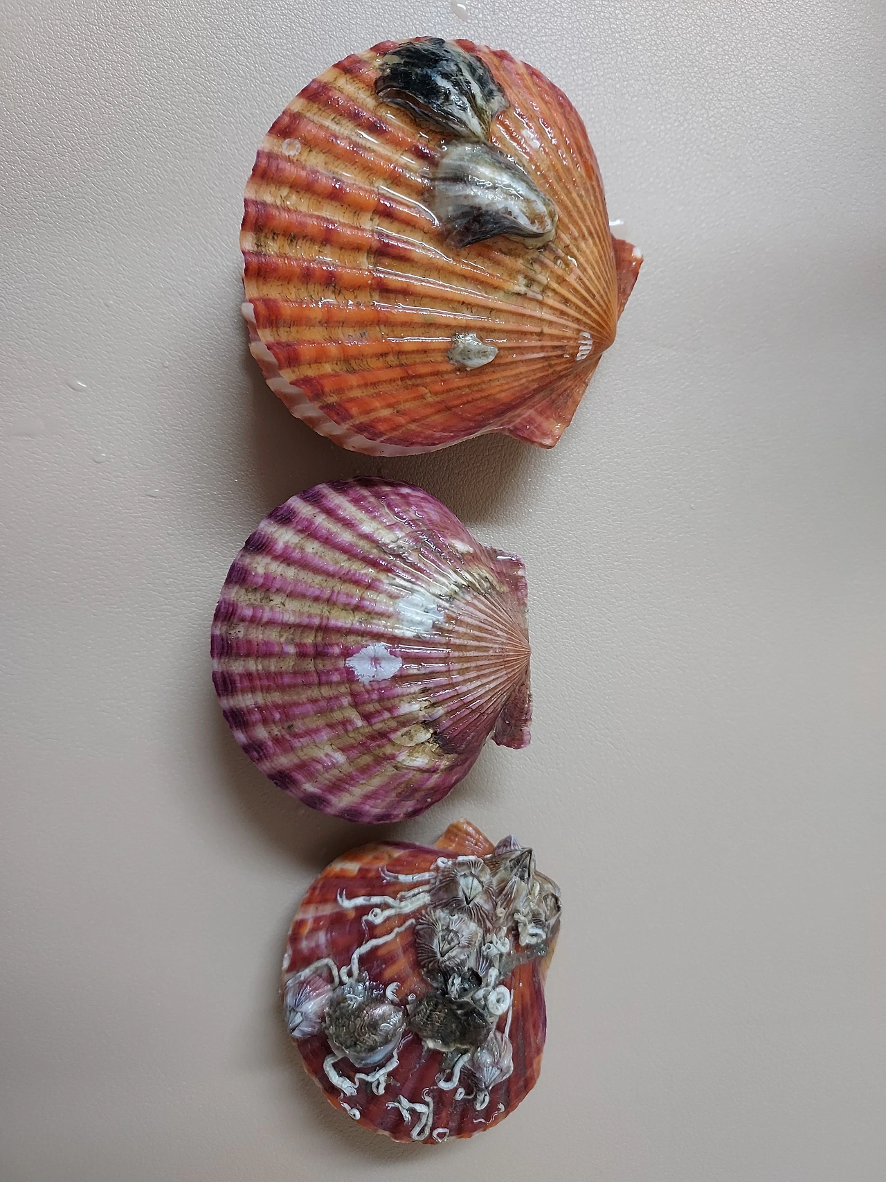 핑크, 보라 조개들이 홍합과 함께 찜기에서 쏙쏙 빠져나온다. 일단 허기를 달랜다. 초고추장을 찍어 한입에 쏙 쏙 쫄깃한 식감과 싱싱함이 입안 가득 바다를 선물했다. 냠냠 쩝쩝... 예쁜 조개껍데기가 뭐라고? 알맹이 먹고 껍데기를 휴지로 닦아 3개를 가방에 챙겼다. 찜 당한 껍데기들이 나를 따라왔다.