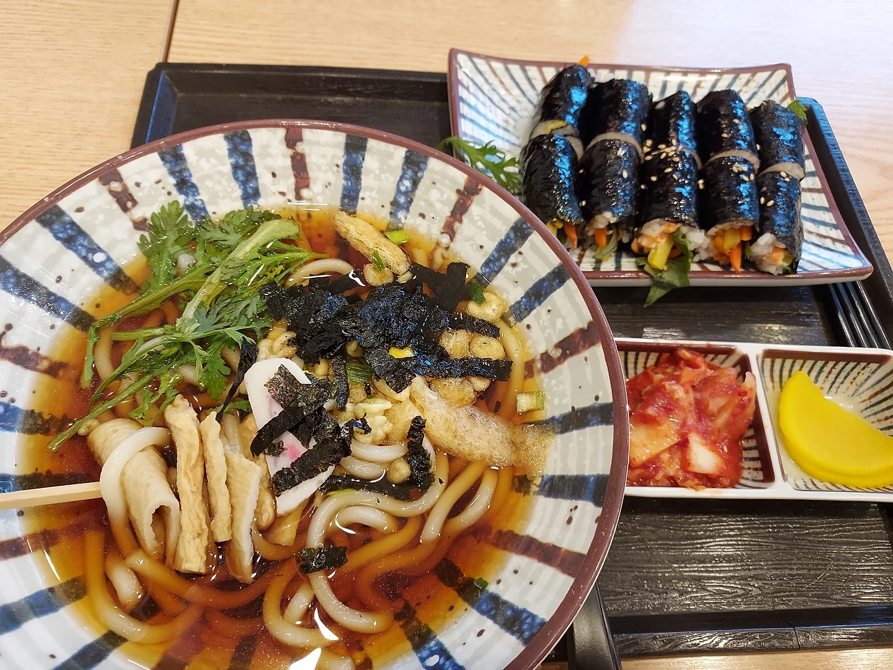 꼬지 가락국수 한 그릇과 꼬마김밥을 먹으며