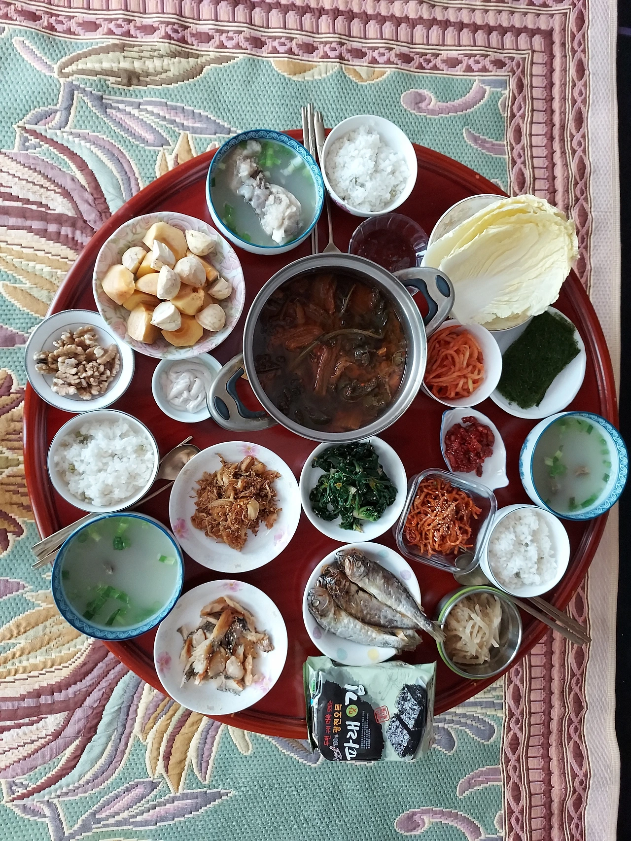질겅질겅 진미채 , 짭조름하고 매콤한 낙지젓갈 , 임금님 밥상에 올랐다는 감태, 충청도 게국지에 뽀얀 사골국물까지... 호두와 단감과 밤, 속배추와 고추장, 파래김도 올라왔다.