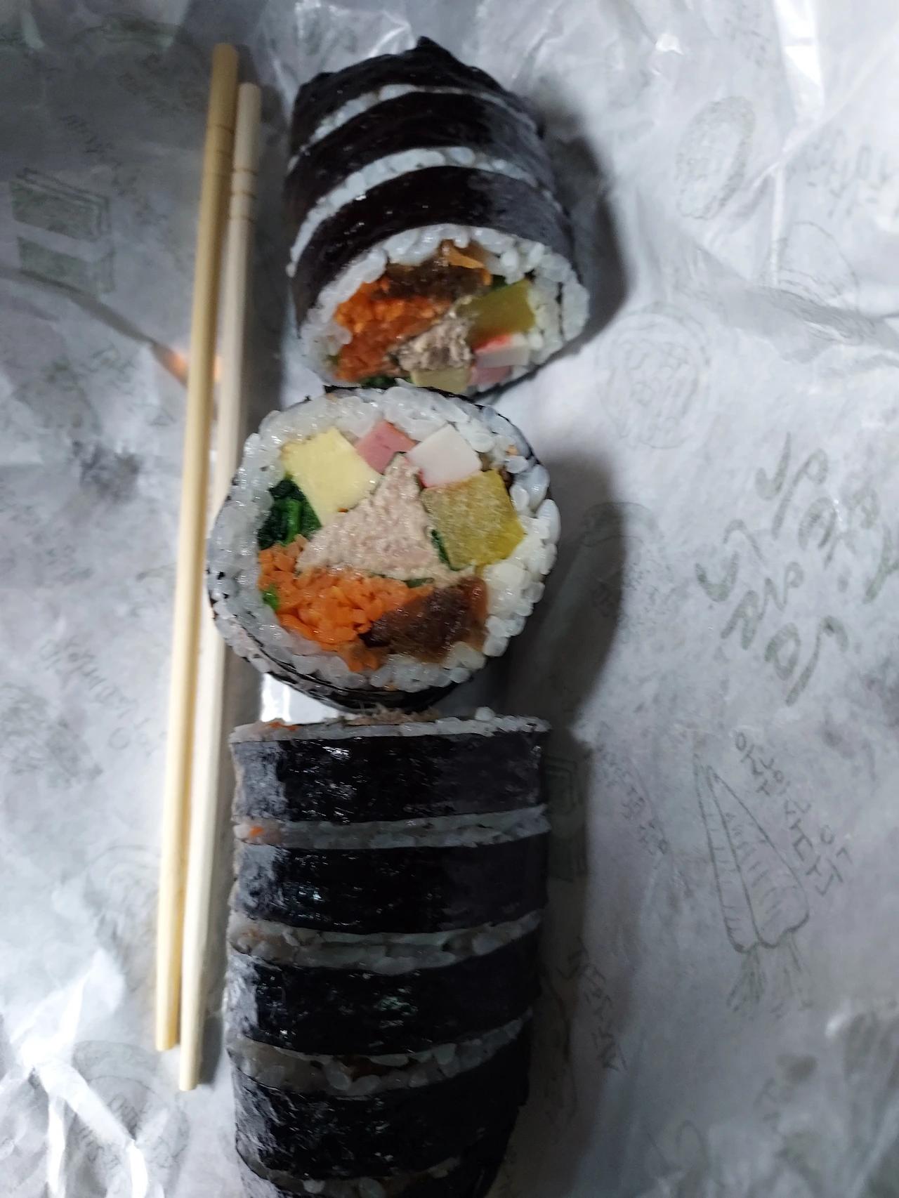 동네 김밥천국 참치김밥은 3500원 두줄이니 7천 원에 생수 2병이 생일 점심이었다.