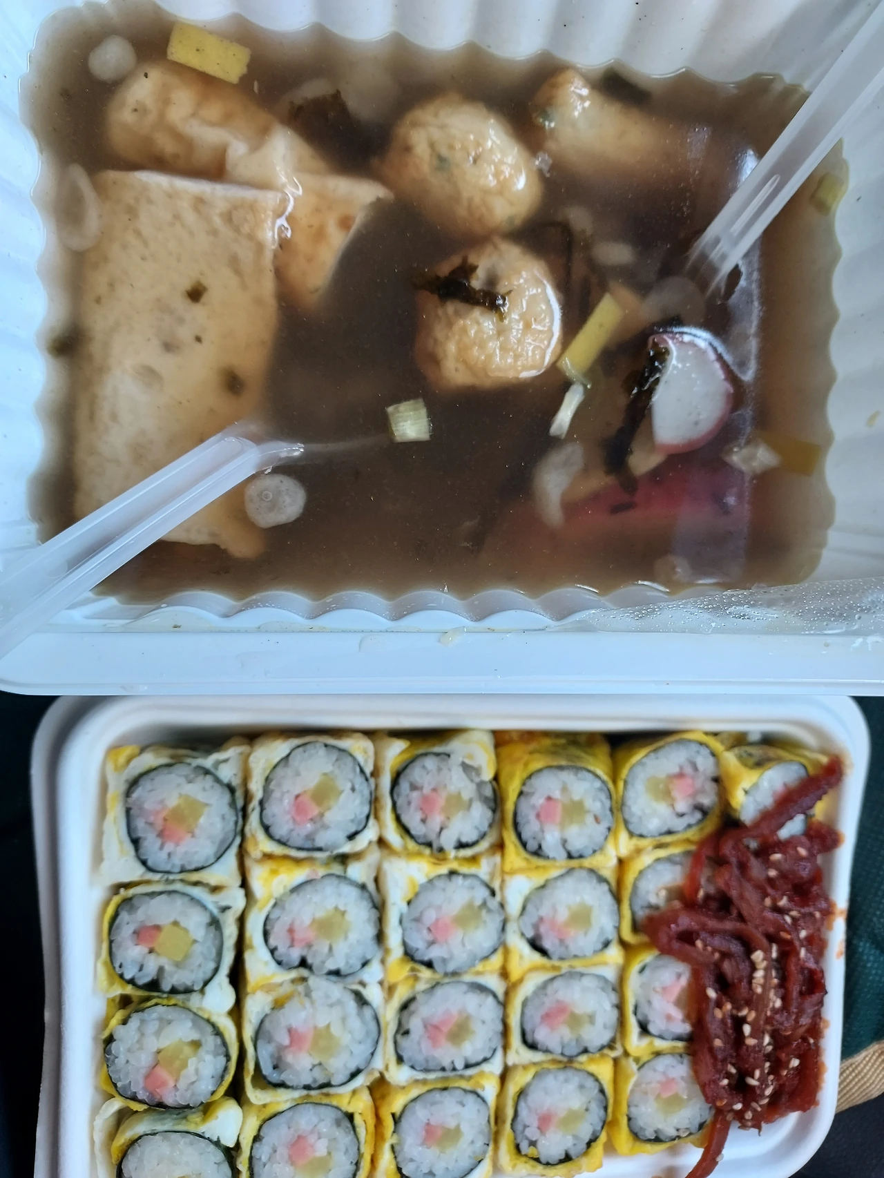 계란말이 김밥 도시락 5천 원 어묵탕 3천 원 합 8천 원 메밀차 공짜에 점심 한 끼를 해결했다.