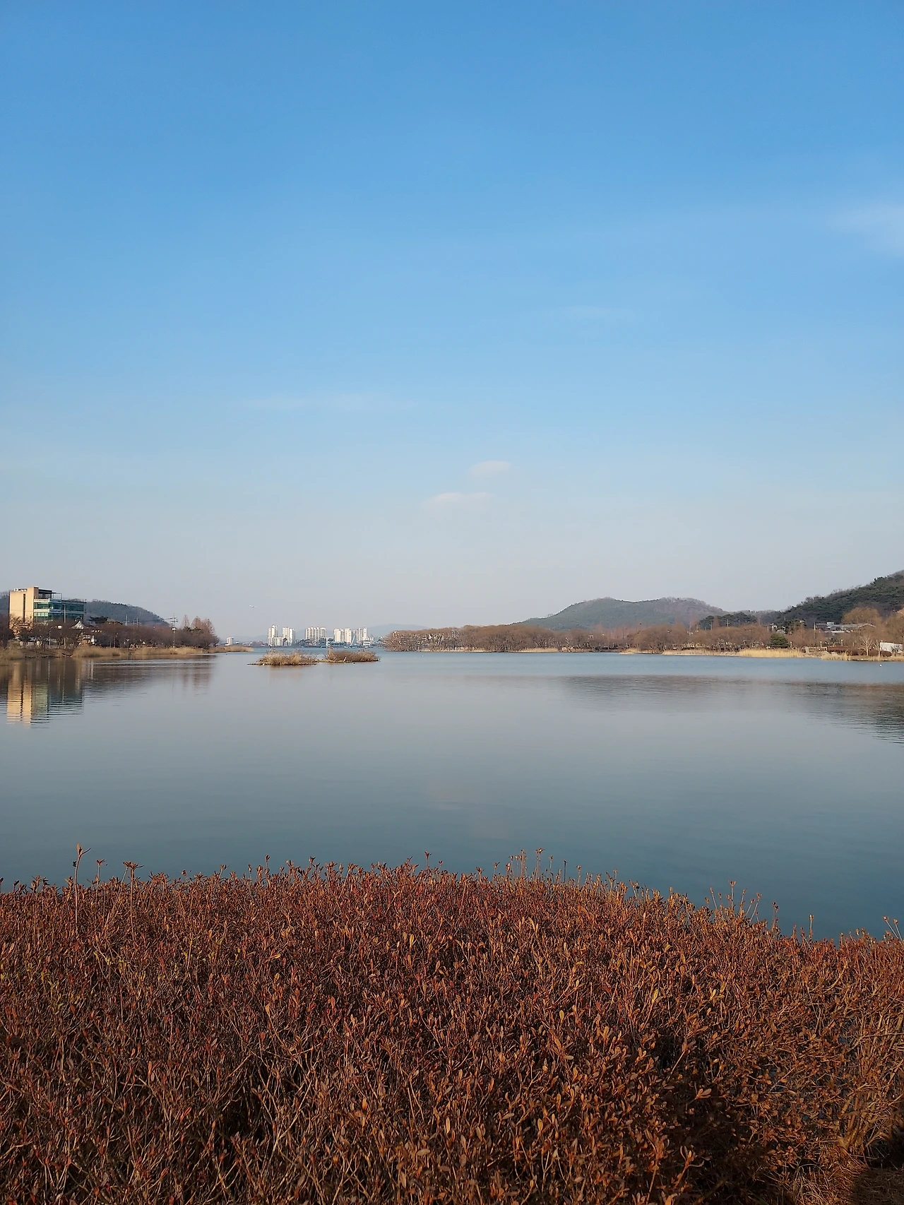 보온병에 뜨거운 메밀차도 데려갔다. 오늘은 작은 야산과 시골 풍경이 보이는 뷰를 선택했다. 꿀맛이다.