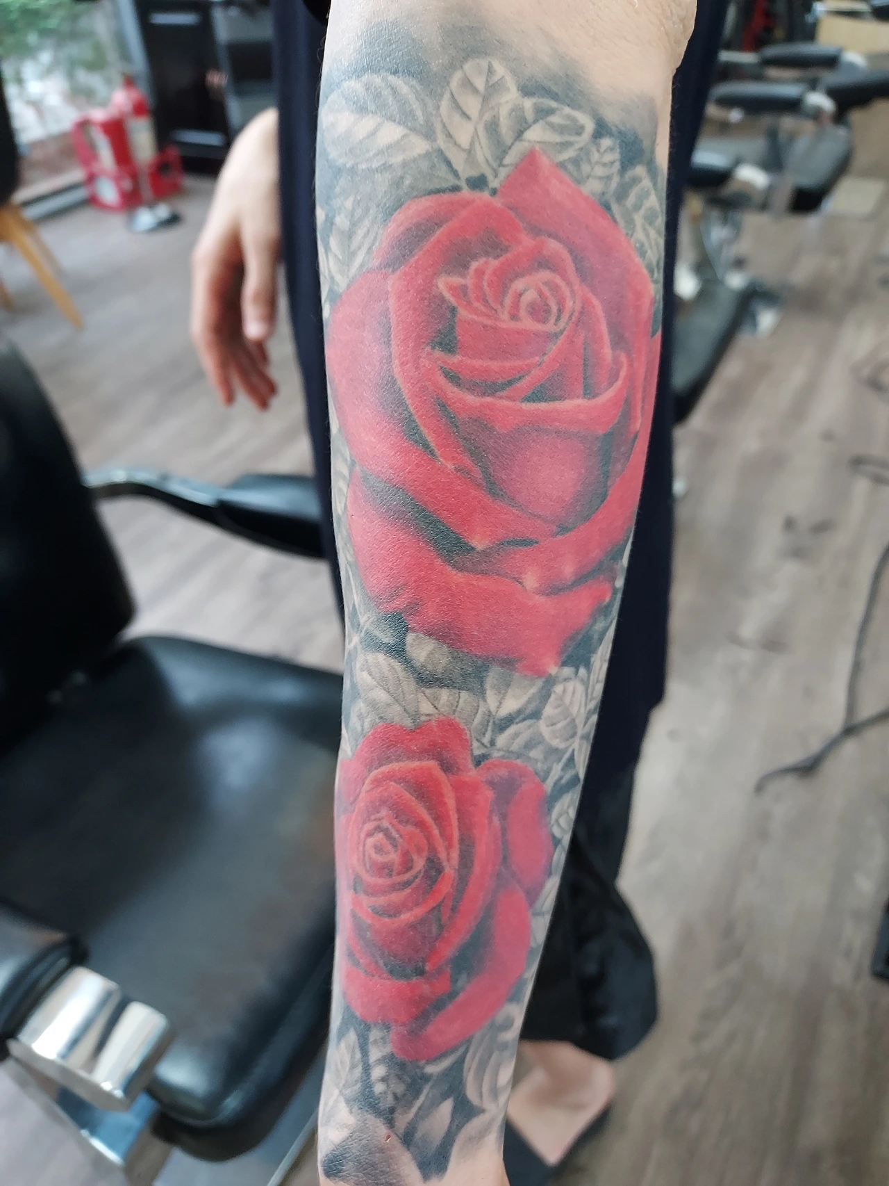 밍이 아빠는 그동안 두 팔에 문신을 아름답게 했다. 장미꽃을