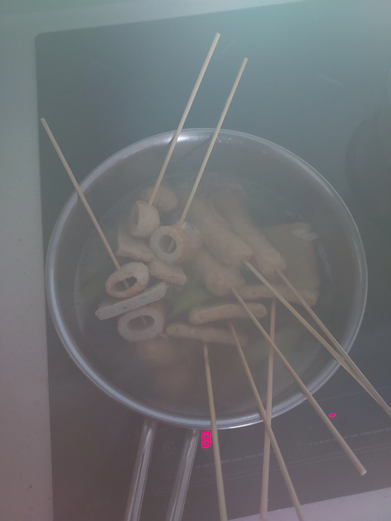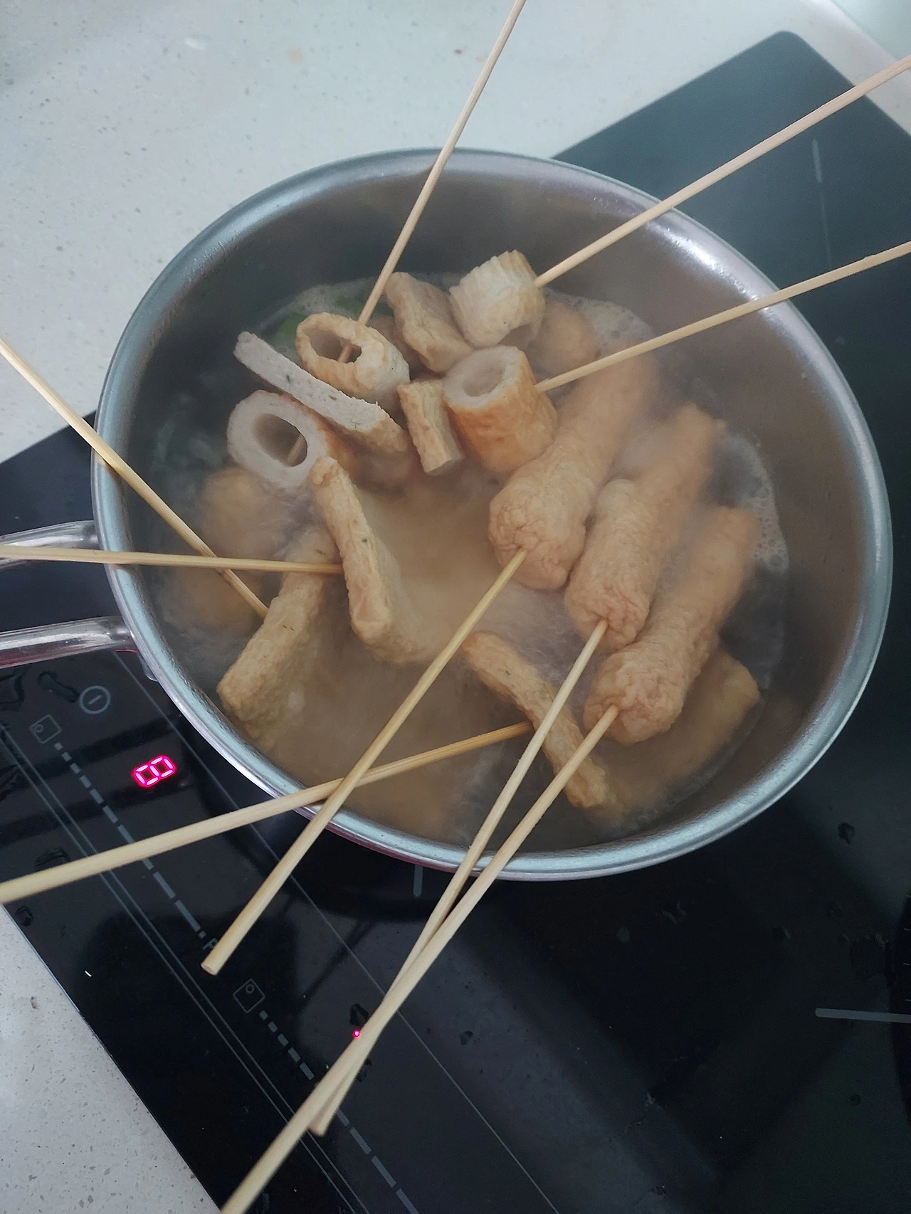 끓이다가 꼬지에 꼽아놓은 어묵을 넣었다.