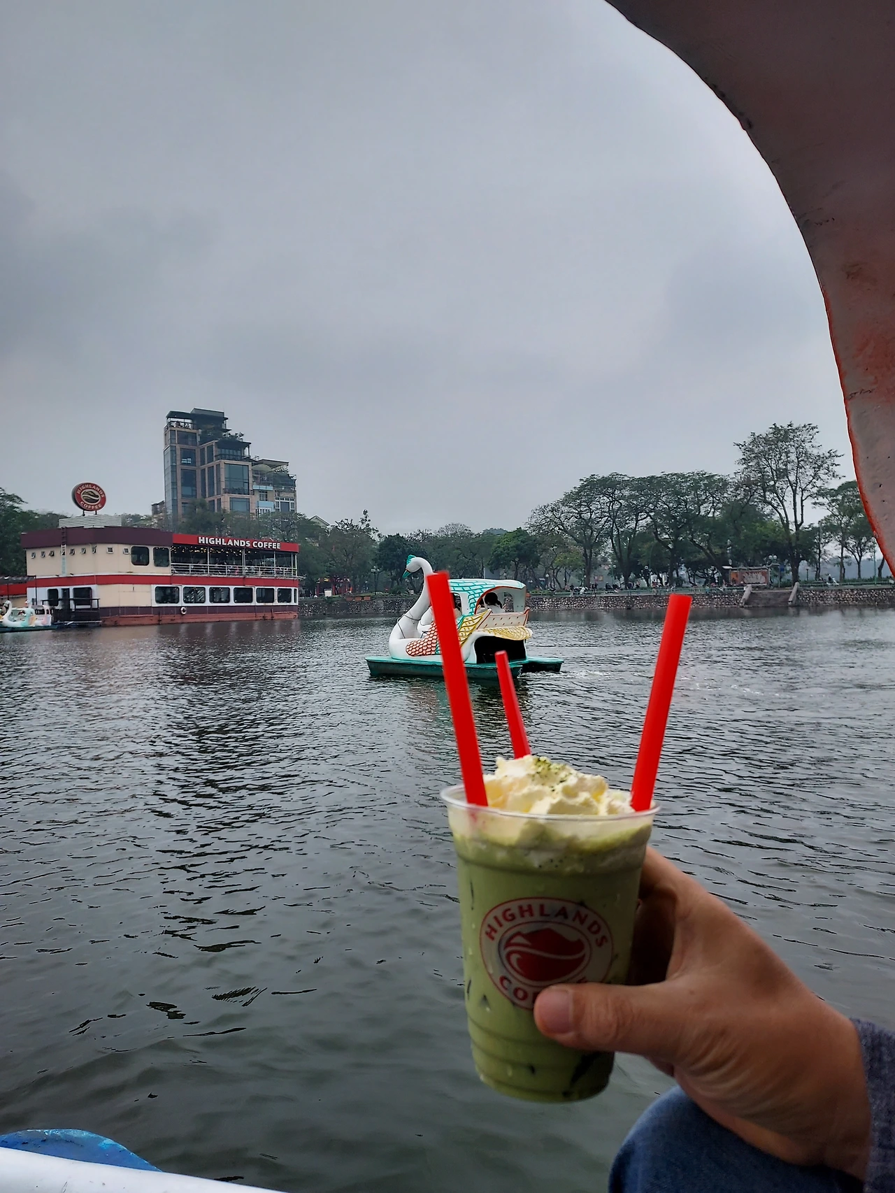 오리배 안에서 사진을 찍고 있었다.