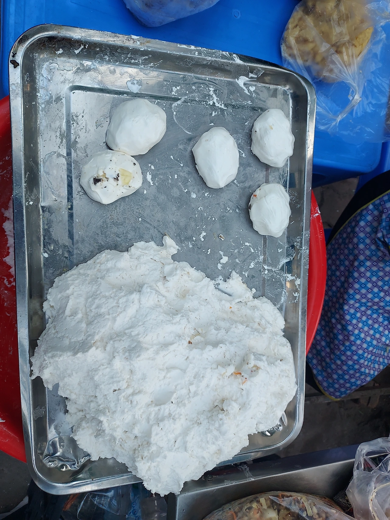 흠 ~길가에서 찹쌀가루 반죽에 잡채 속을 넣어 프라이팬에 굽고 있다. 앙금 팥? 속을 넣어 동굴 하게 빚는 아줌마도 이 더위에 고생이 많다.