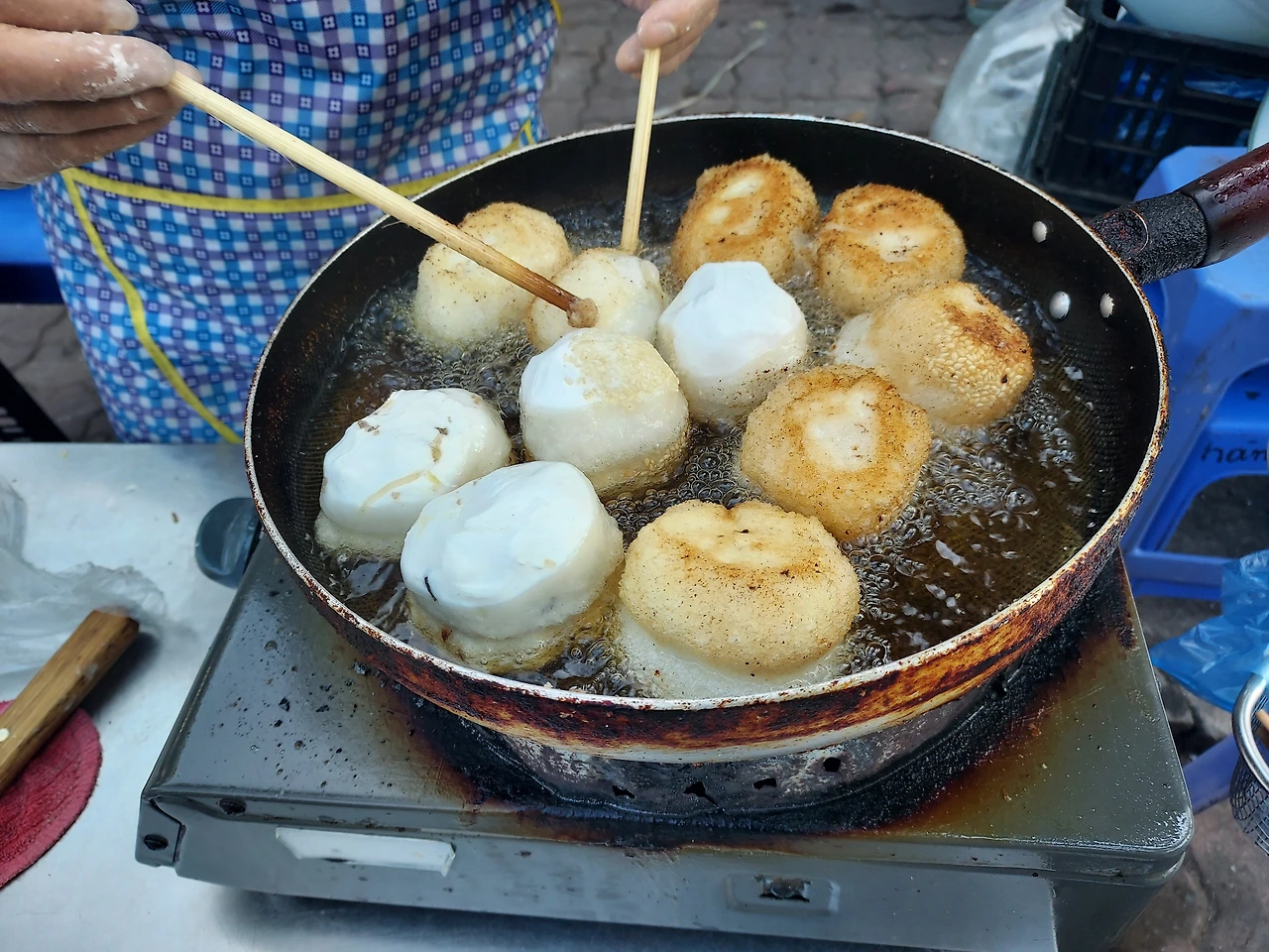 생김새는 그리 예쁘지 않았지만 겉은 바싹 속은 촉촉 속재료는 잡채와 앙금팥이고, 찹쌀 반죽이라 도넛 같은 느낌이다. 기름냄새에 바잉 뚜라는 베트남 간식이다. 충동구매다.