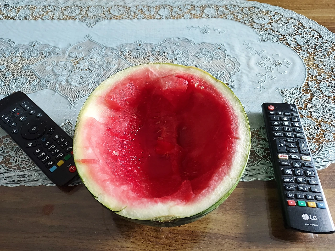 ~반토막난 수박덩어리가 소파 앞 탁자에