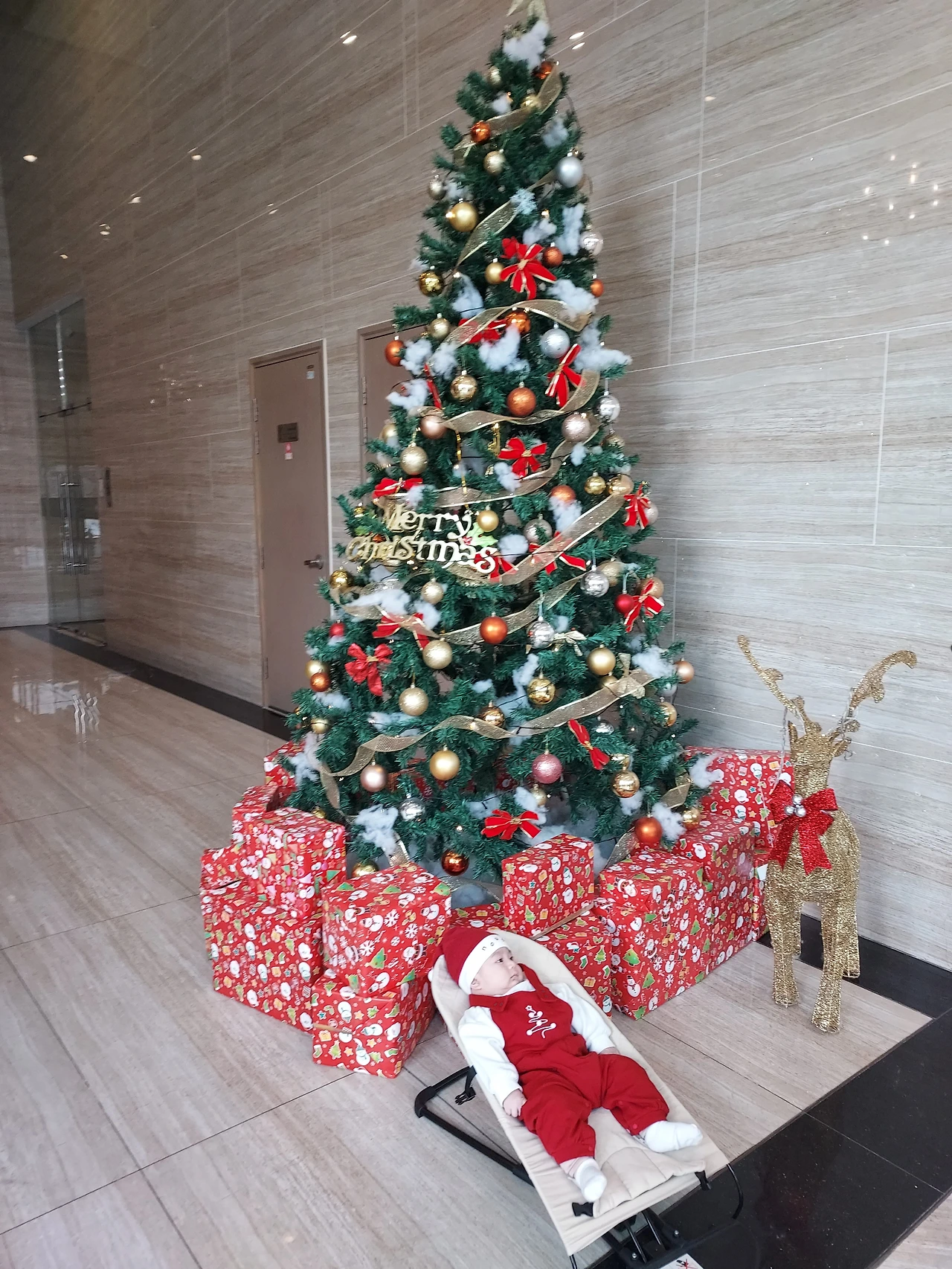아기는 울지도 않고 크리스마스를 즐겼다.