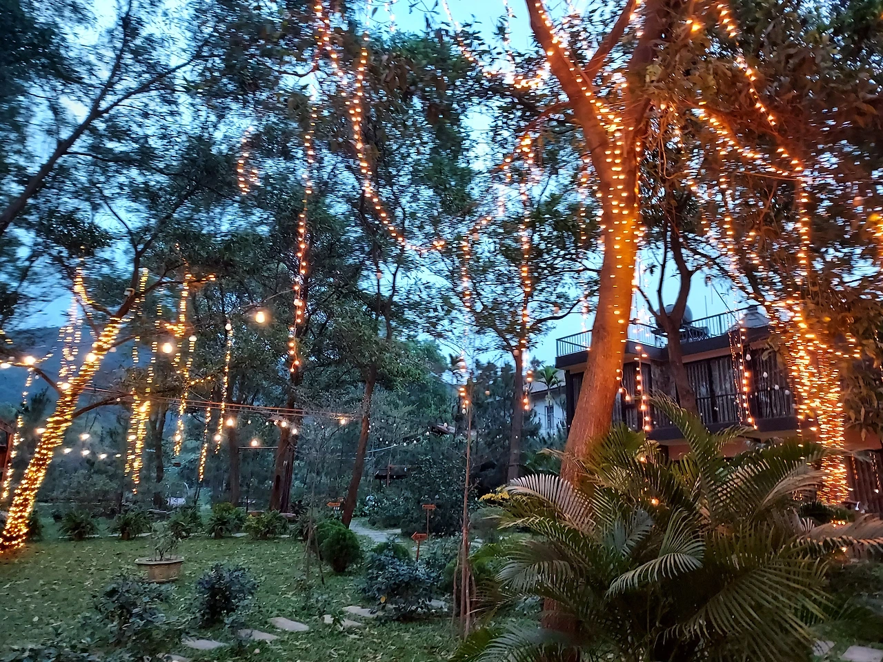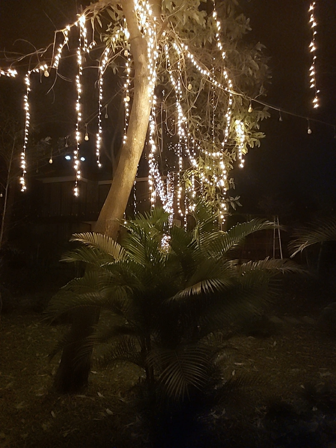 늘어진 나뭇가지에 꼬마전구가 풀어헤친