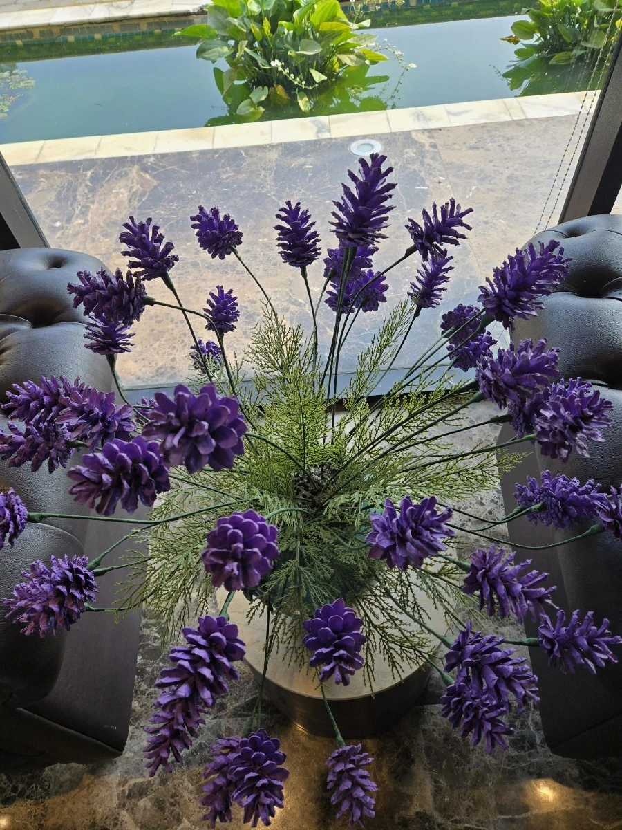 쓸모없는 솔방울이 보랏빛 꽃으로 다시