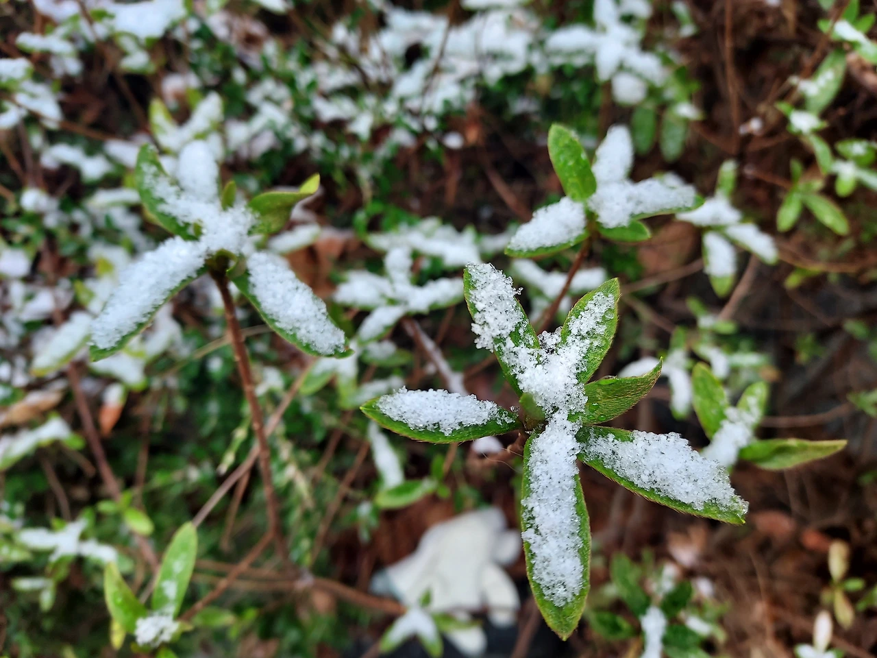 눈송이를 받아 든 잎사귀들이 곱다.