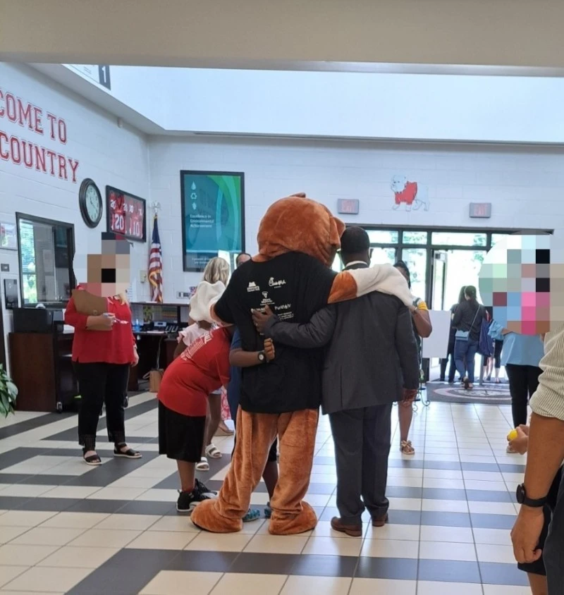 우리는 진작에 학교 문 앞에 줄을 섰고 아침 9시가 되니 학교 문이 쫙 열렸고, 기대에 찬 마음으로 아이들과 신나게 학교로 들어갔다. 과연 미국 초등학교는 어떻게 생겼을까 하고 너무 궁금했다. 와~~~~!!! 학교에 들어서는 순간 또 놀랬다. 학교에 마스코트도 있고, 학교 분위기가 엄청 밝고 생동감이 넘쳤다. 확실한 건, 내가 어렸을 때 다니던 그런 초등학교 분위기는 확실히 아니었다. 물론 비교불가지만.