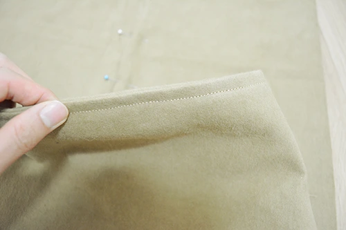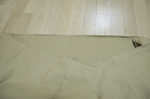 3. 원단을 뒤집어 준 후 겉면 바닥에 그려놓은 박음질선을 따라 전체 박음질해준다.