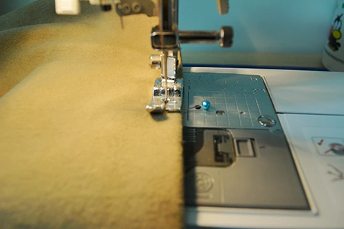 2. ①번에서 박은 원단을 겉과 겉끼리 맞대게 핀으로 고정시키고 창구멍을 남겨두고 둘레를 박아준다.