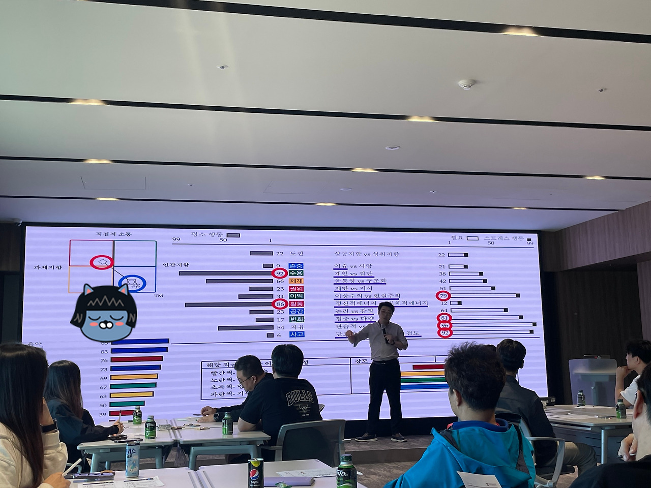 버크만 진단은 숫자와 bar 형태로 마음 내면이 표현되는 게 있는데, 그걸 서로 나누면서 '아.. 우리 팀장님이 이랬구나..;, '저분은 불만이 있는데 참고 있구나..' 등을 알게 되니까 서로 장난도 치고, 분위기도 띄워주시고 하더라고요.